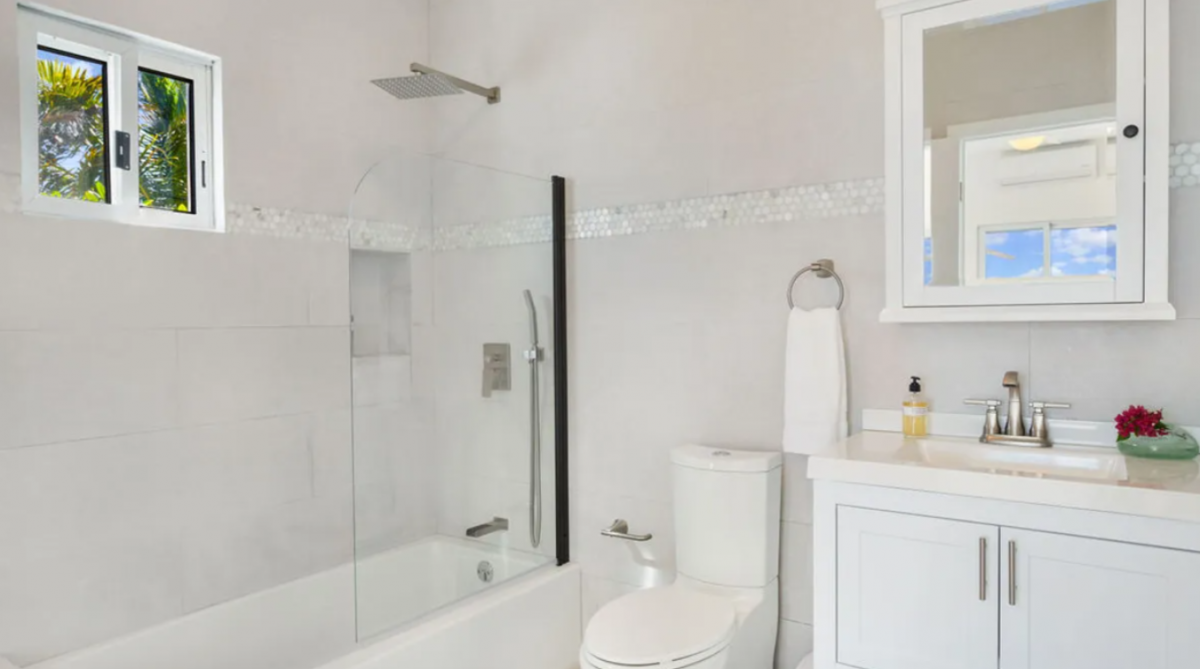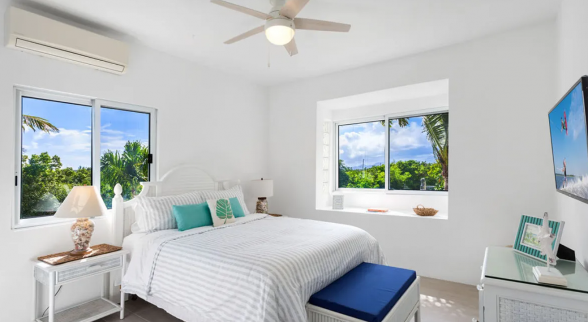 Bedroom 3: This room is equipped with a queen-sized bed, air conditioning, a ceiling fan, and a shared bathroom with a bathtub and shower combination.