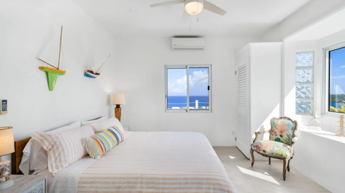 Bedroom 4: This room is equipped with a queen-sized bed, air conditioning, a ceiling fan, and a shared bathroom with a bathtub and shower combination. Bedroom 4 has a sea view.