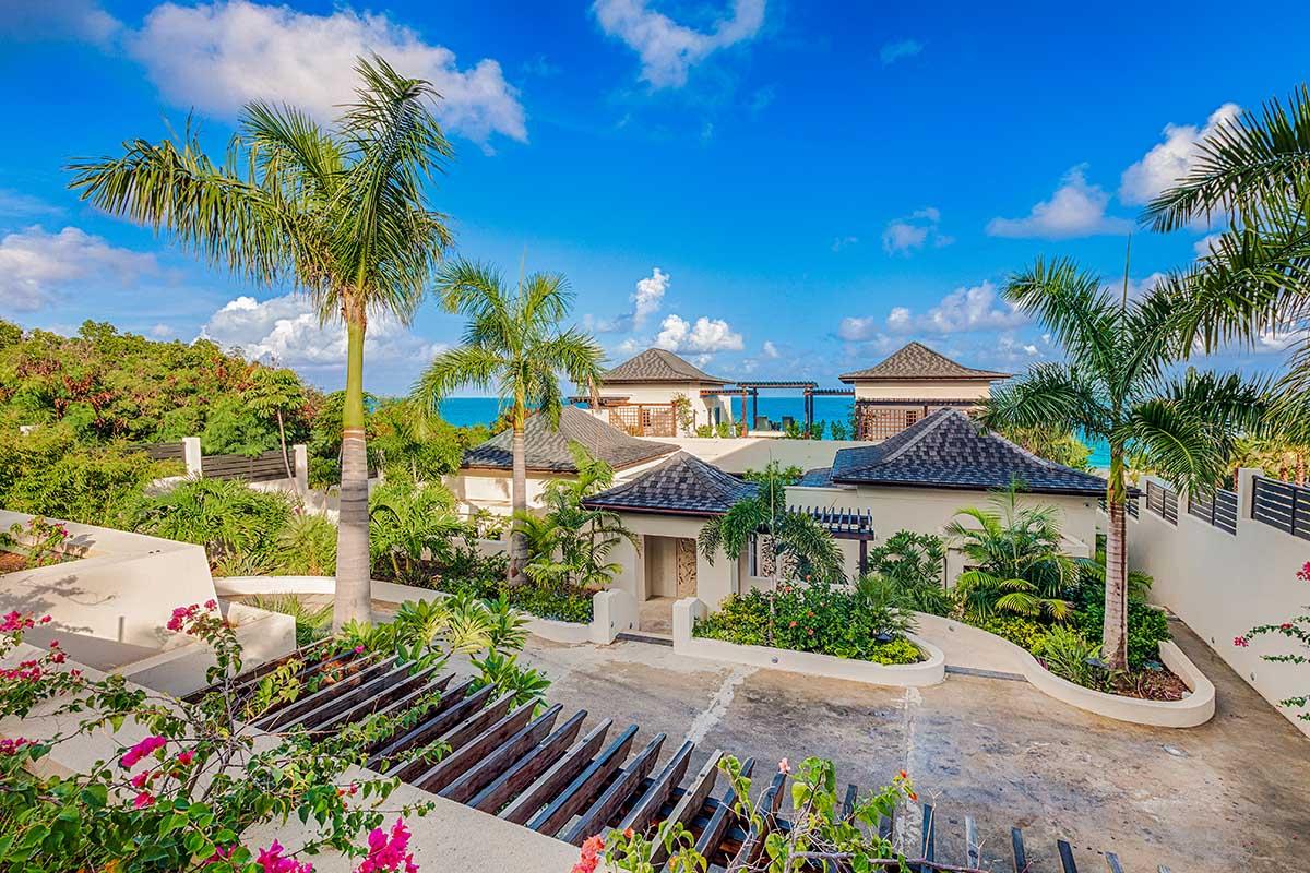full bathroom and separate powder room shared with bedroom 7, stand-alone shower and bathtub, TV, terrace- Bedroom 9: Cabana bedroom with king bed, ensuite bathroom with stand-alone shower, TV, wrap-around terrace with garden and ocean views
