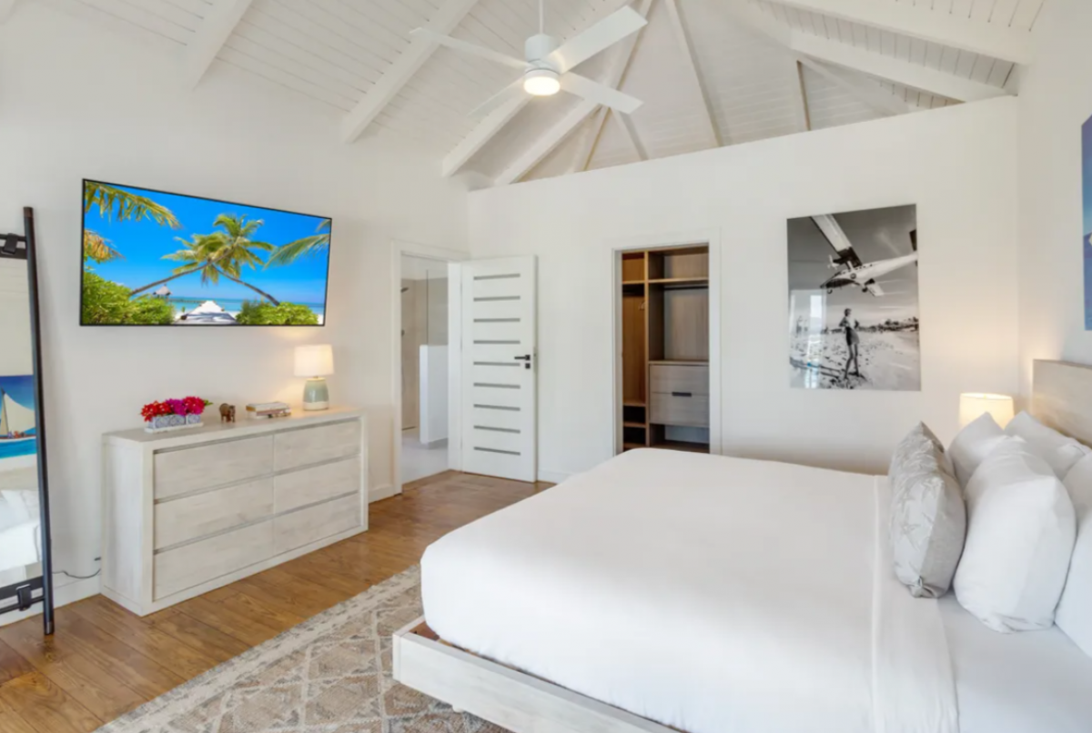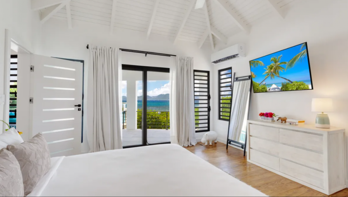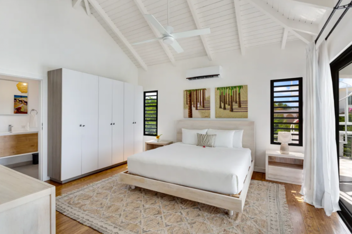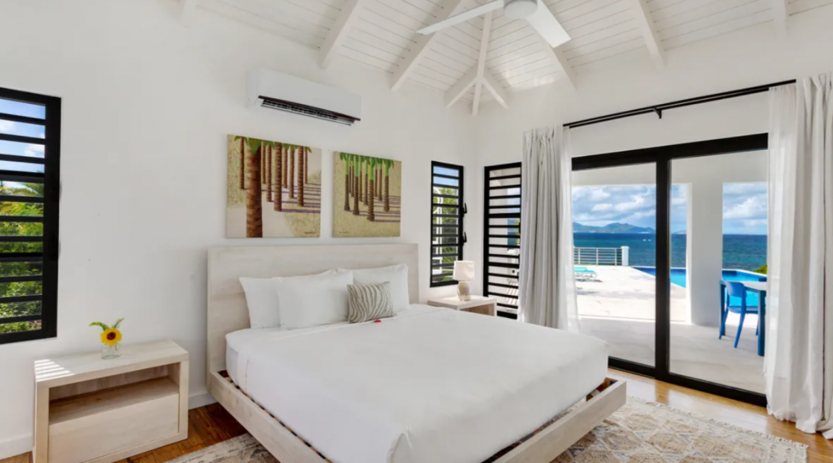 Bedroom 2: King bed with ac, ceiling fan, television, bedside charging ports, direct access to pool terrace with ocean view, and ensuite bathroom with walk-in shower and double vanity.