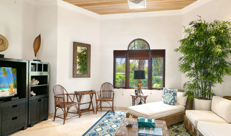 Bedroom 4: King bed, ground floor, ensuite bathroom with soaking tub, indoor and outdoor shower, double vanity, AC, ceiling fan, TV, desk, seating area, garden and partial ocean view