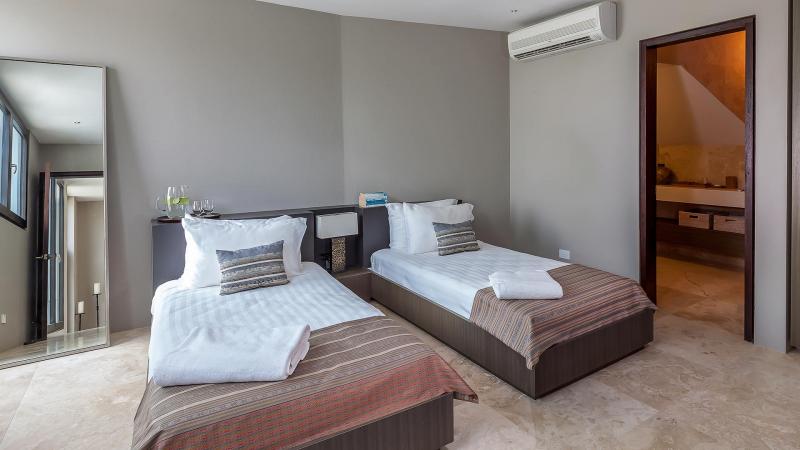 Bedroom 5: This room is equipped with two twin-sized beds, air conditioning, a ceiling fan, and an ensuite bathroom with a shower.