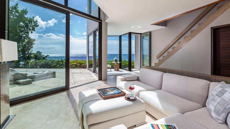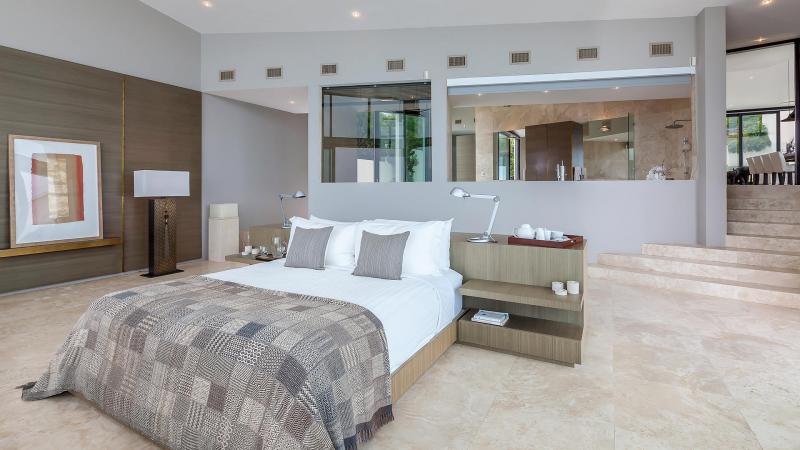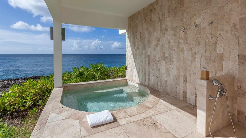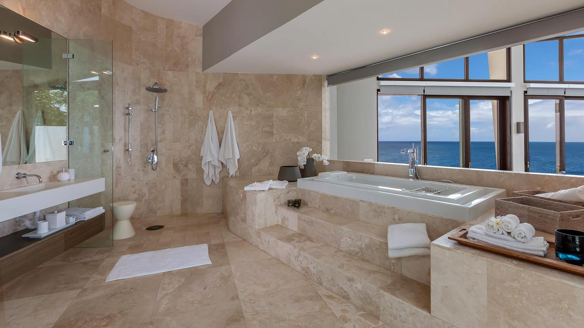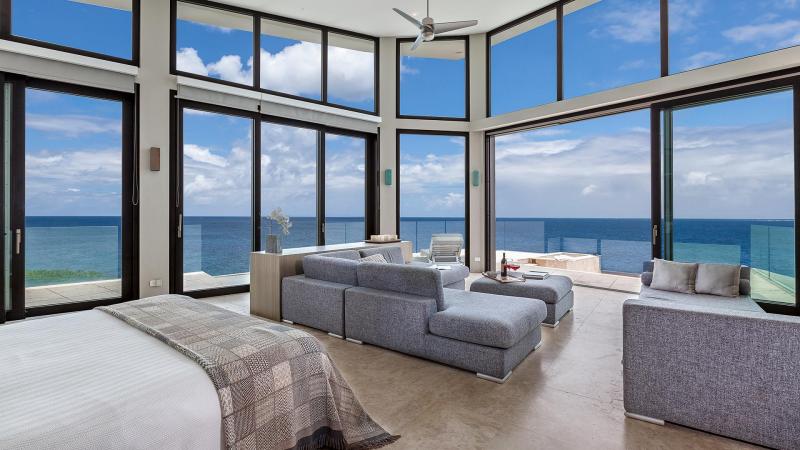 Bedroom 2: This room is equipped with a king-size bed, air conditioning, a ceiling fan, a television, a lounge area, a mini fridge, and an ensuite bathroom with a soaking bathtub with an ocean view, a walk-in shower, and double vanities. Bedroom 2 also has a private terrace with panoramic ocean views.