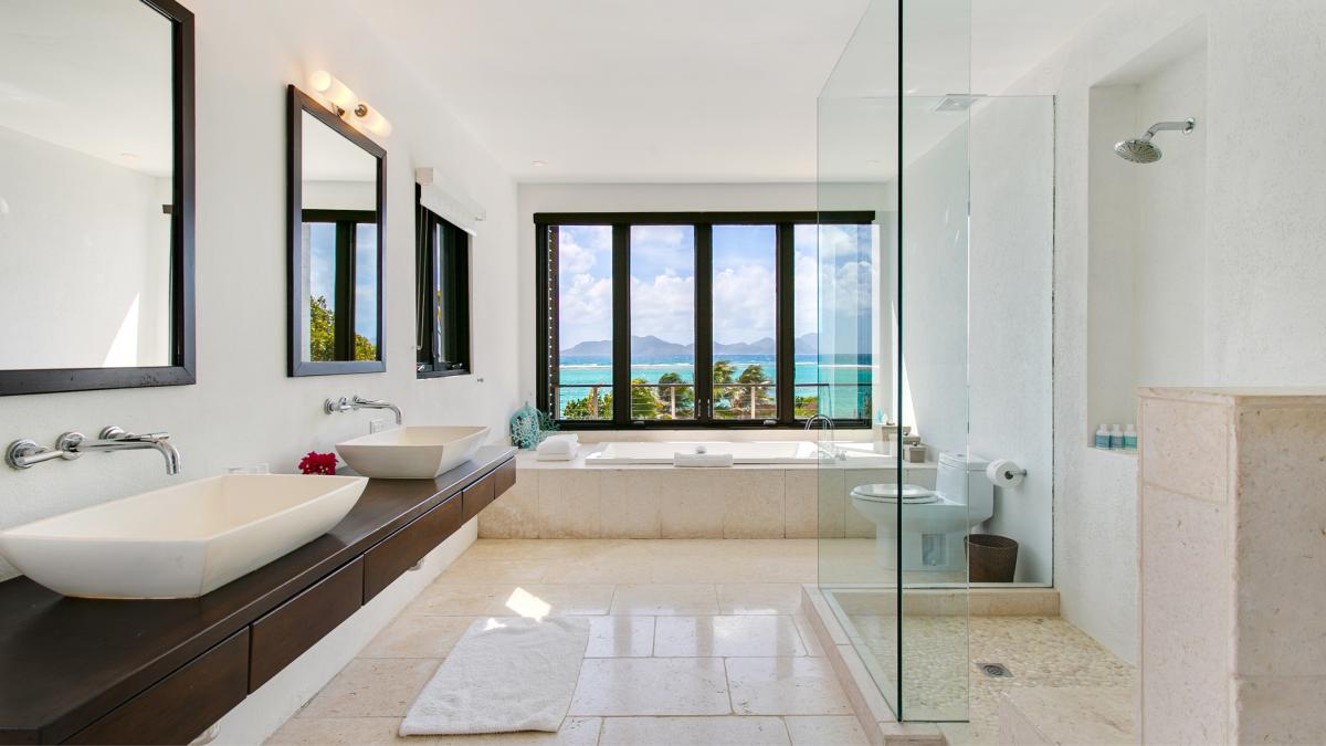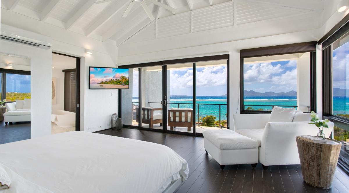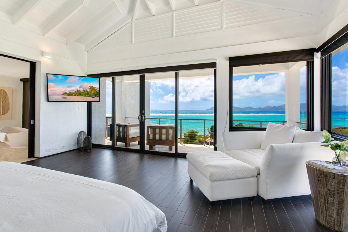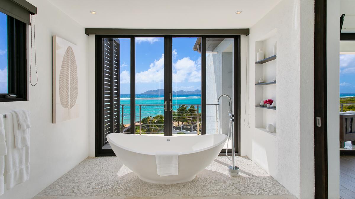 Primary Bedroom: This room is located on the upper level and is equipped with a king-sized bed, air conditioning, a ceiling fan, a television, and an ensuite bathroom with a freestanding bathtub, indoor and outdoor showers, and double vanities. The Primary Bedroom also opens onto a furnished terrace with a view of the sea and St. Martin in the distance.