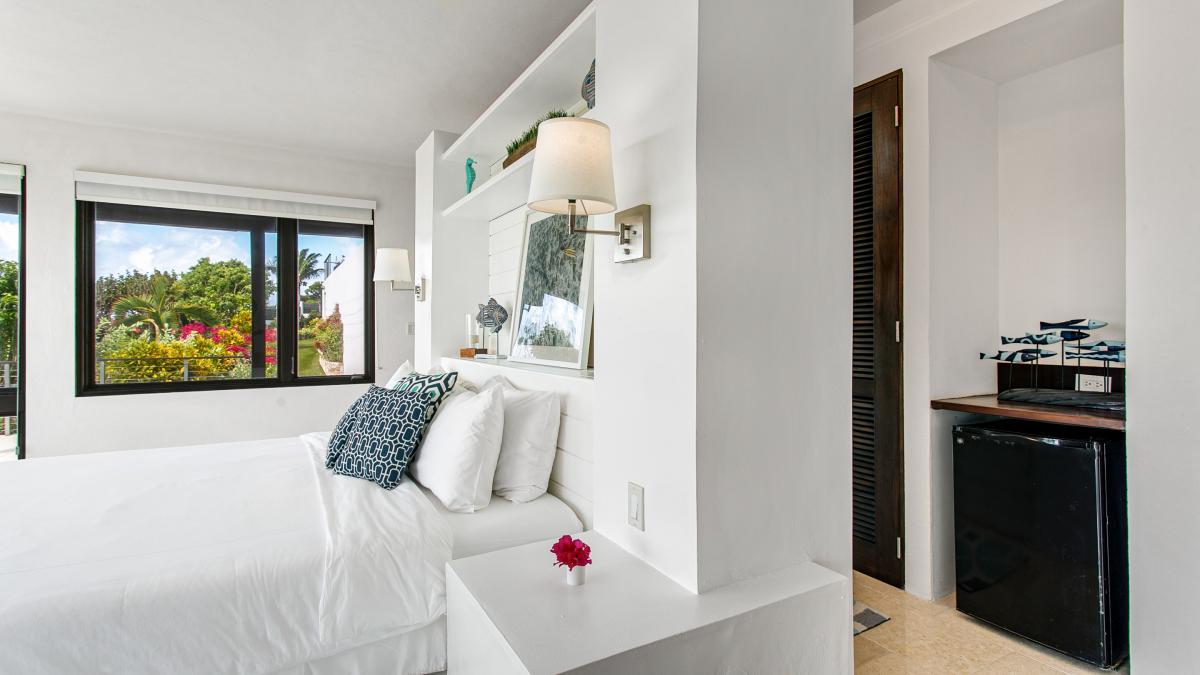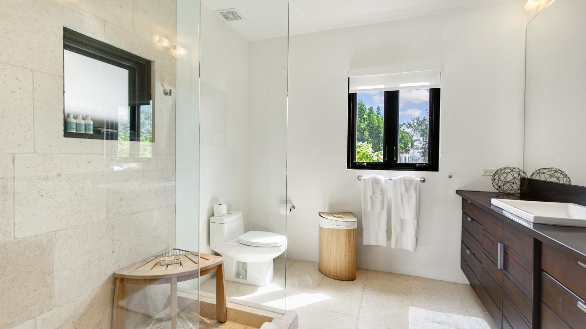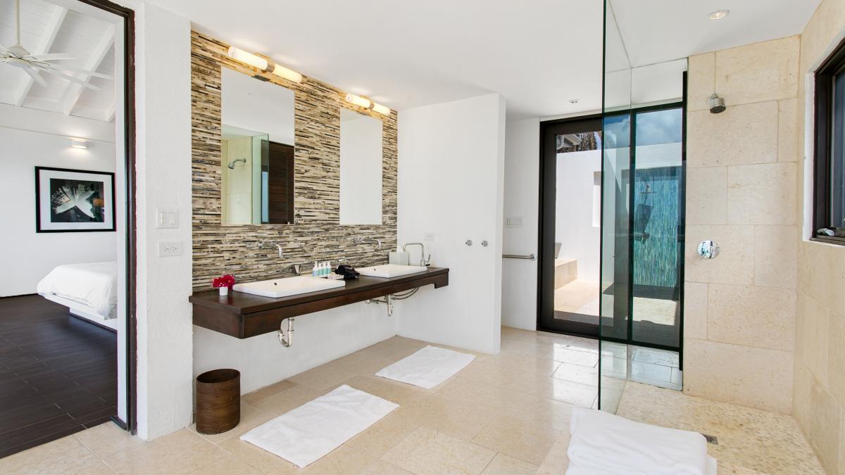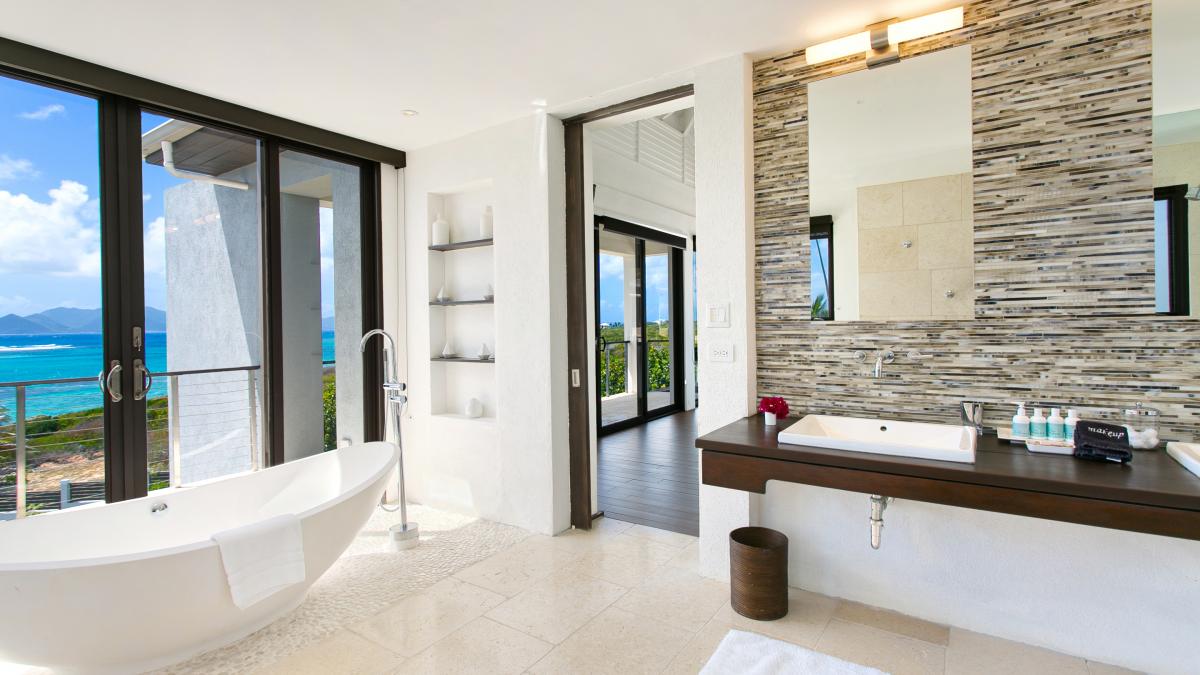 Primary Bedroom: This room is located on the upper level and is equipped with a king-sized bed, air conditioning, a ceiling fan, a television, and an ensuite bathroom with a freestanding bathtub, indoor and outdoor showers, and double vanities. The Primary Bedroom also opens onto a furnished terrace with a view of the sea and St. Martin in the distance.