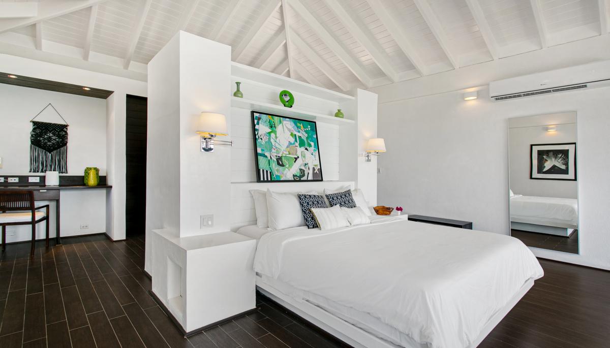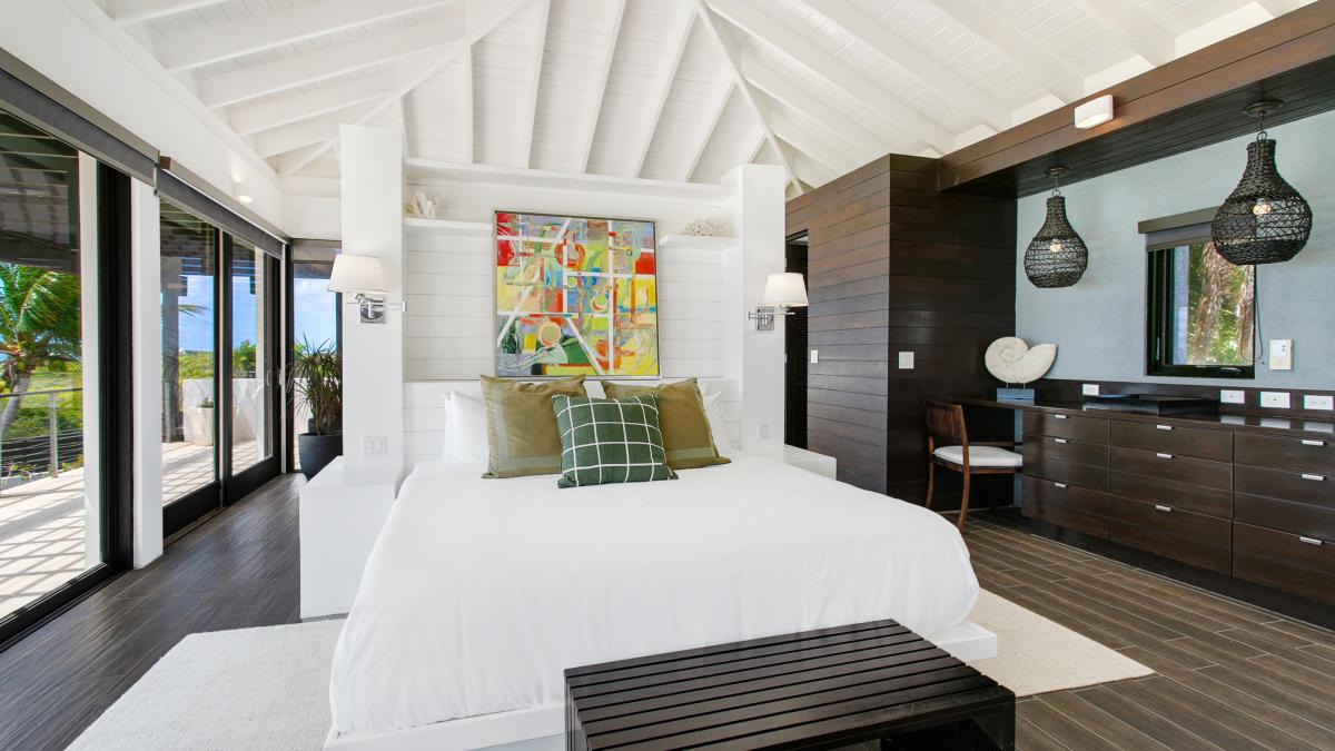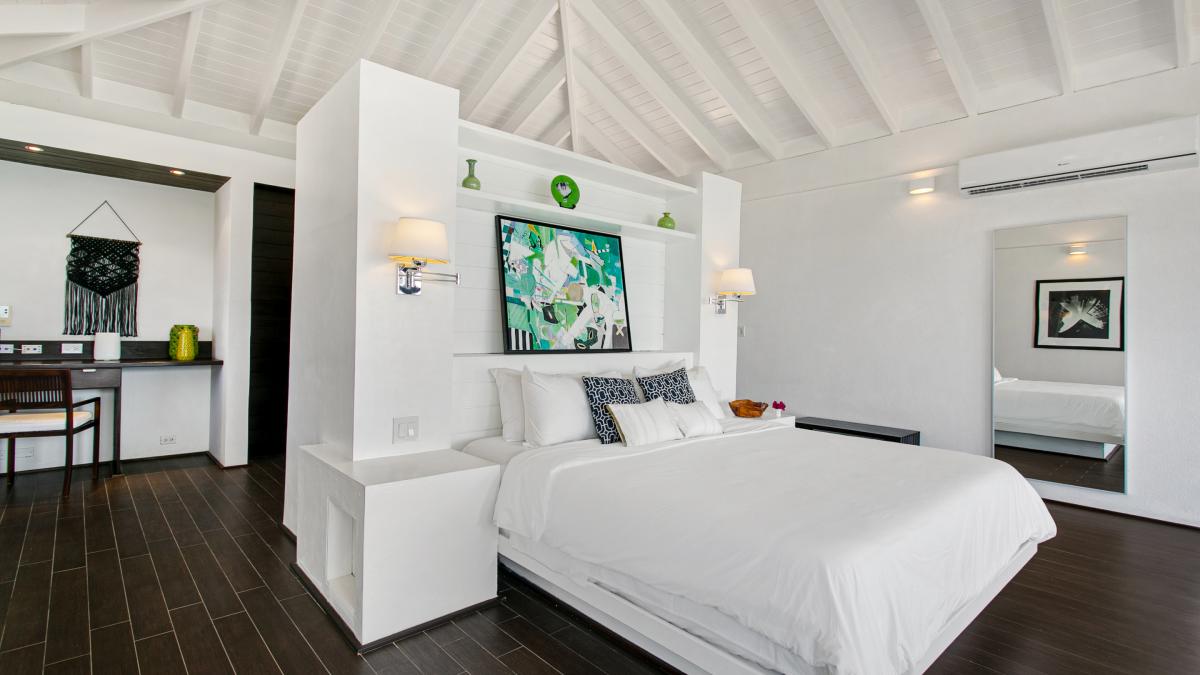 Bedroom 2: This room is located on the upper level and is equipped with a king-sized bed, air conditioning, a ceiling fan, a television, and an ensuite bathroom with a soaking bathtub, indoor and outdoor showers, and double vanities. Bedroom 2 also opens onto a furnished terrace with views of the sea and St. Martin in the distance.