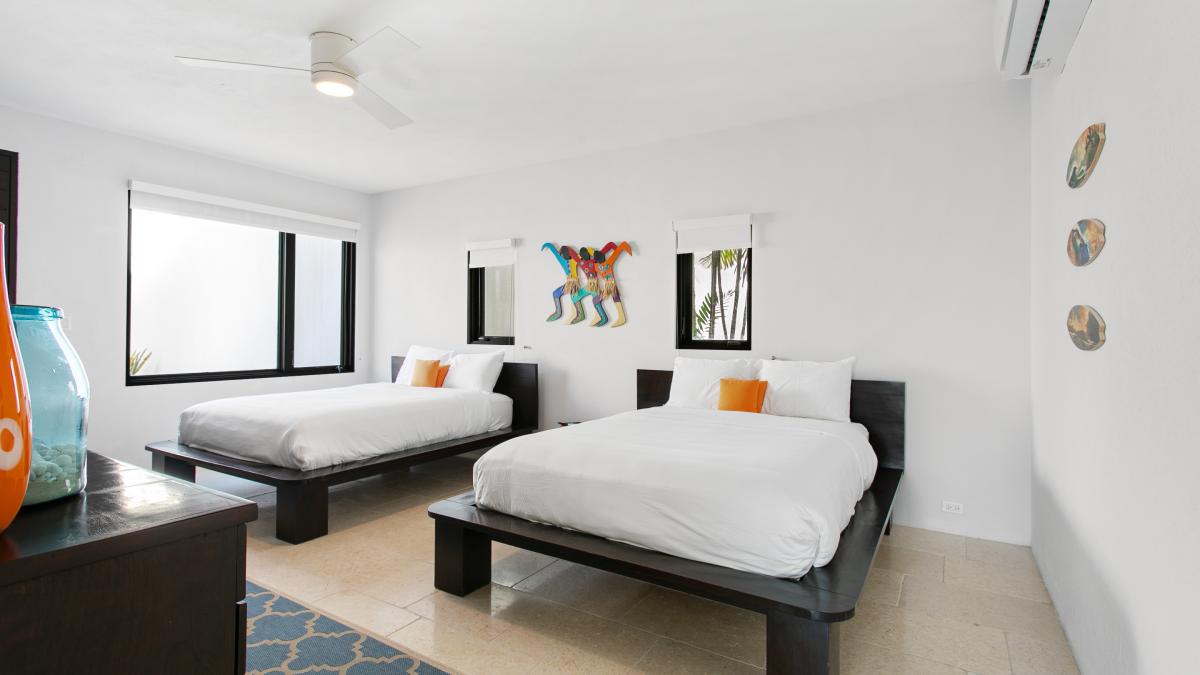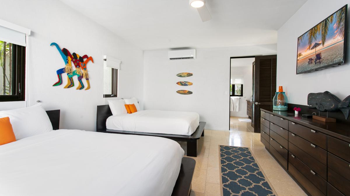 Bedroom 3: This room is located on the lower level and is equipped with a king-sized bed, air conditioning, a ceiling fan, a television, and an ensuite bathroom with a soaking bathtub, shower, and double vanities. Bedroom 3 also adjoins with Bedroom 4 and opens onto a furnished patio with a sea view.
