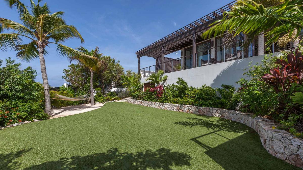 Villa Odyssey offers an artificial turf where guests can enjoy games such as cornhole, and it also has a natural grass area where guests can play kickball or croquet. This Anguilla rental also offers an entertainment area with couches, a bar, fire pit, stools on the beach, and an outdoor screen and projector for the perfect way to end a day.