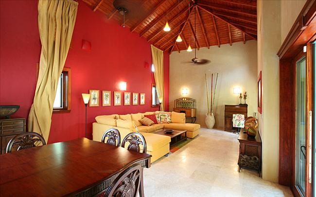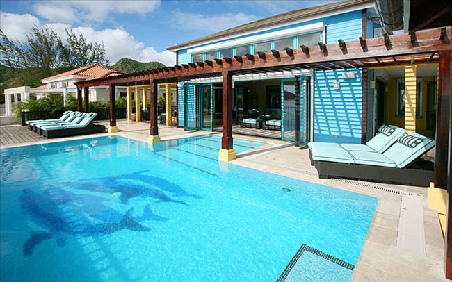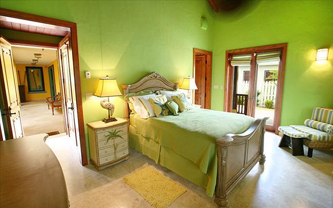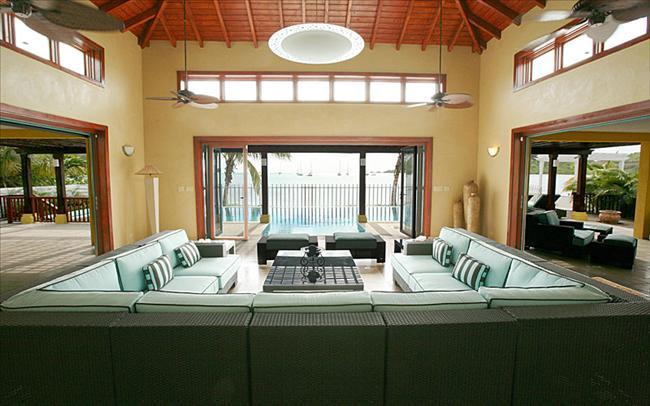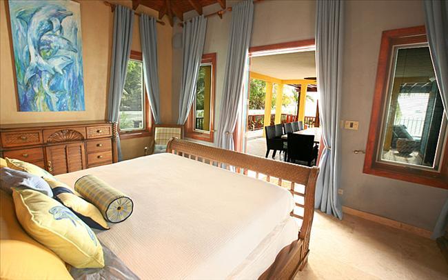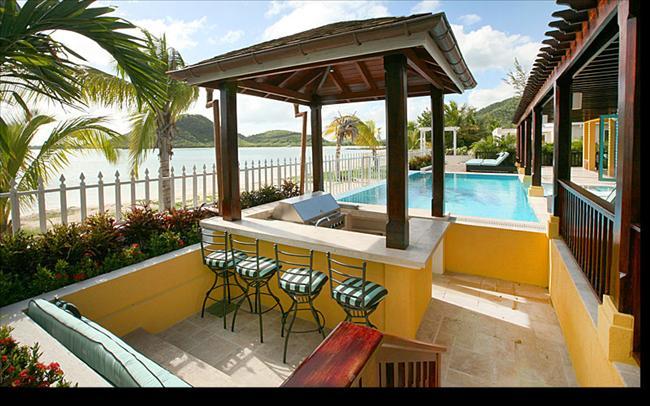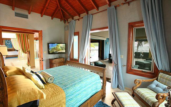 Tropical Breeze has a magnificent entrance that leads you into what can only be described as an exceptional villa. The décor in each and every room is exquisite, filled with beautiful furnishings, fresh inviting colors and impeccable taste. Throughout the villa there is a sense of tranquility within the spacious, sumptuous rooms. The use of color throughout and the beautiful high wooden beamed ceilings with an array of high windows letting in the light, give this home its panache. This villa has a spectacular open plan sitting and dining room which then leads out to a spacious veranda with a dining table to seat 12, for al-fresco eating. There are four generous double bedrooms with bathrooms, two of which are master bedrooms each having large Jacuzzi tubs and showers. They are all screened with ceiling fans and air conditioning. This villa sleeps 8 people comfortably. There are plasma televisions in all rooms. The large terrace wraps gently around the villa. The swimming pool at the back is just steps away from the villa’s wall to wall glass doors of the lounge with the terrace along either side of it. There is a barbecue on one side, and on the other side a space to laze in the sunshine and enjoy the views. This unique beachfront villa enjoys the calm waters of Jolly Harbour, perfect for children and is in the perfect location for spectacular sunsets to be enjoyed every night along with the light, tropical breezes as they move gently across the bay. Tropical Breeze is absolutely perfect whatever your desires, be it a getaway holiday, honeymoon or even a small select conference. It is also an ideal location for intimate wedding receptions or functions with its spacious living and entertaining areas. This exceptional villa has a daily maid service, security system, hurricane shutters, radio/stereo in all rooms as well as outside and internet throughout. There is also a large relaxing TV room which is separate from the Lounge. Tropical Breeze can also be rented as a two bedroom villa.