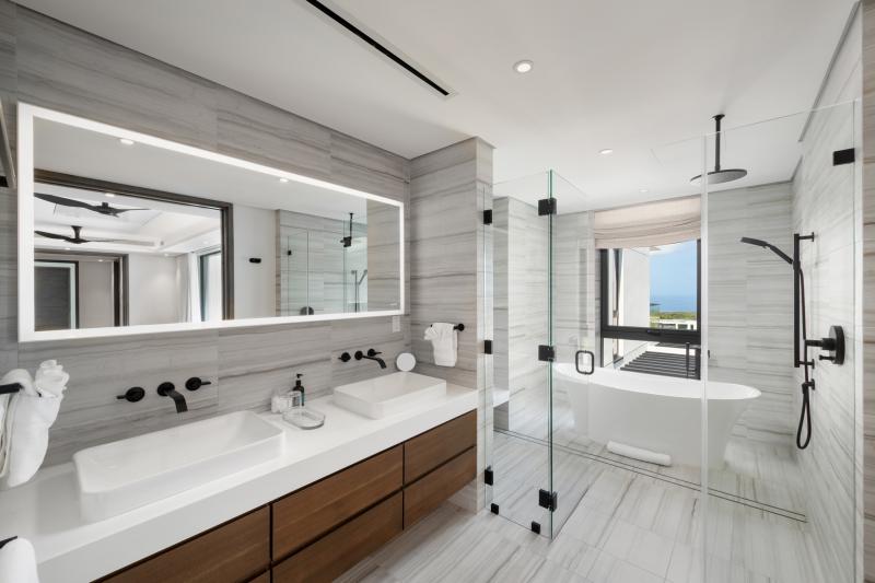 Bedroom 1: King bed, ensuite bath with tub, shower, and double vanity