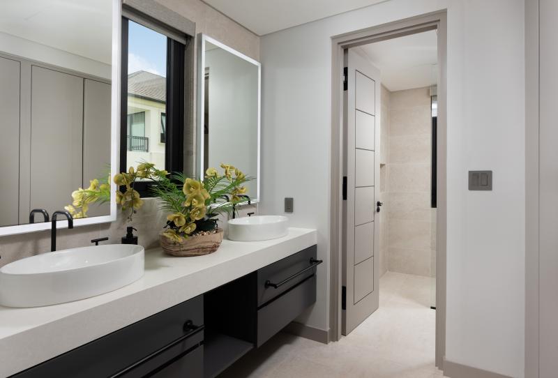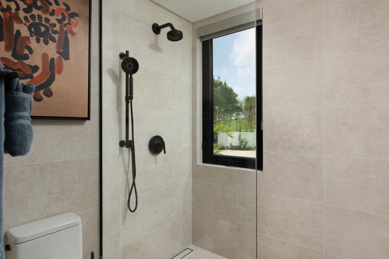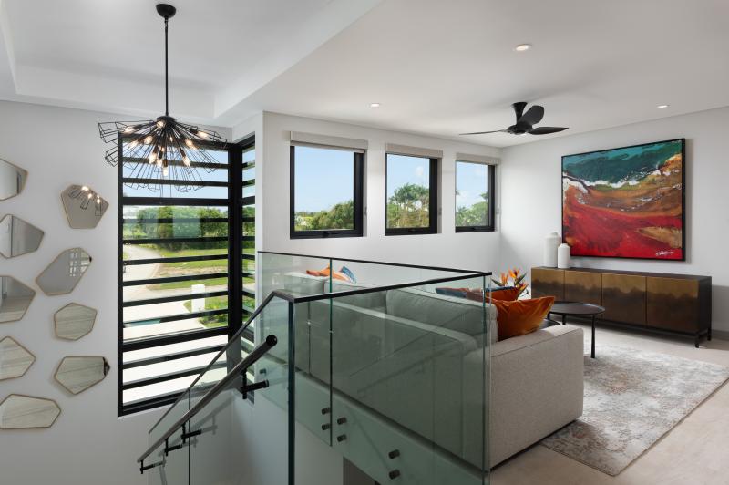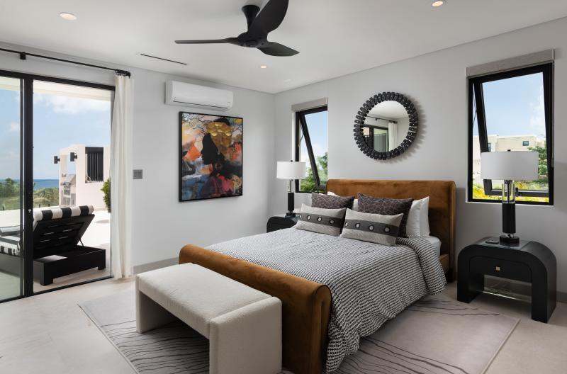 Each of the four bedrooms features its own character, with modern finishes, vibrant accents, and private patios or terraces designed for quiet mornings or unwinding after a long day in the sun. Two bedrooms are located on the ground floor and two upstairs, where you’ll also find a secondary lounge and a private office—ideal if a little work needs to happen during your Barbados luxury villa stay. Thoughtfully designed for adults, the home blends comfort and style in every corner.