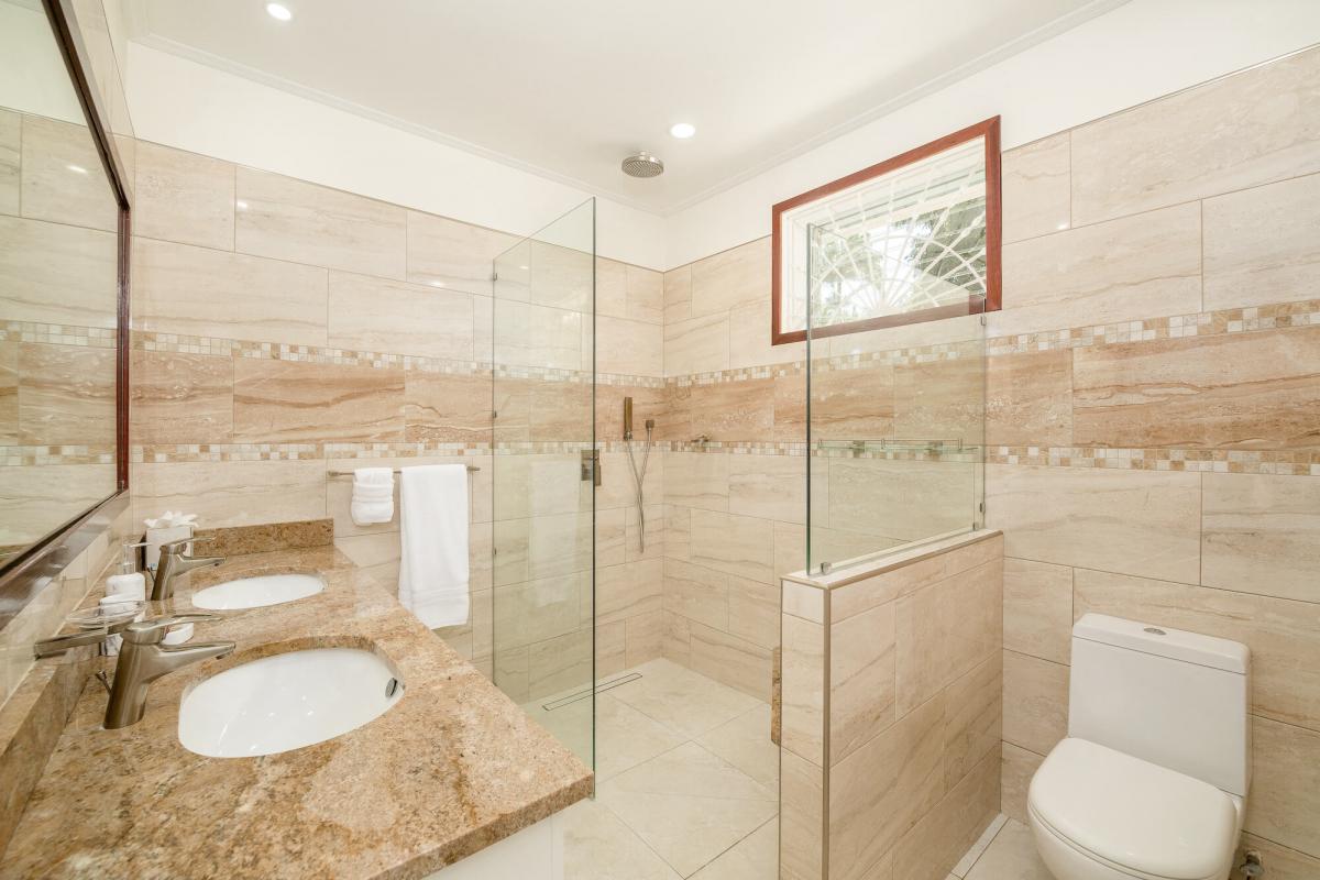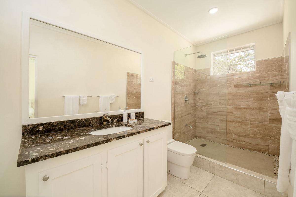 Halle Rose has over 6,000 square feet of covered living area and sits on more than two and a half acres, making it an excellent spot for relaxation and socialization. The villa has breathtaking sea views to the west, surrounded by majestic mahogany trees. To the south and east lies the Old Nine golf course, equipped with a clubhouse, bar, and tennis facilities. The entrance of Halle Rose welcomes guests to an elegantly furnished reception area that flows to the dining terrace that overlooks the pool and gardens. The dining terrace connects to the bedroom wings through an open corridor. To the right of the reception room is a family room that offers a casual space for relaxation. A formal dining room also connects to a fully equipped kitchen with a dumbwaiter for easy food delivery. The main level also houses a gym and a guest cottage with two bedrooms, a bathroom, living areas, and its entrance for extra privacy. The north hallway leads guests to the coral stone deck and pool area, which features sun loungers and umbrellas and connects to two of the spacious bedrooms. The south hallway leads guests to another bedroom and the primary bedroom suite.