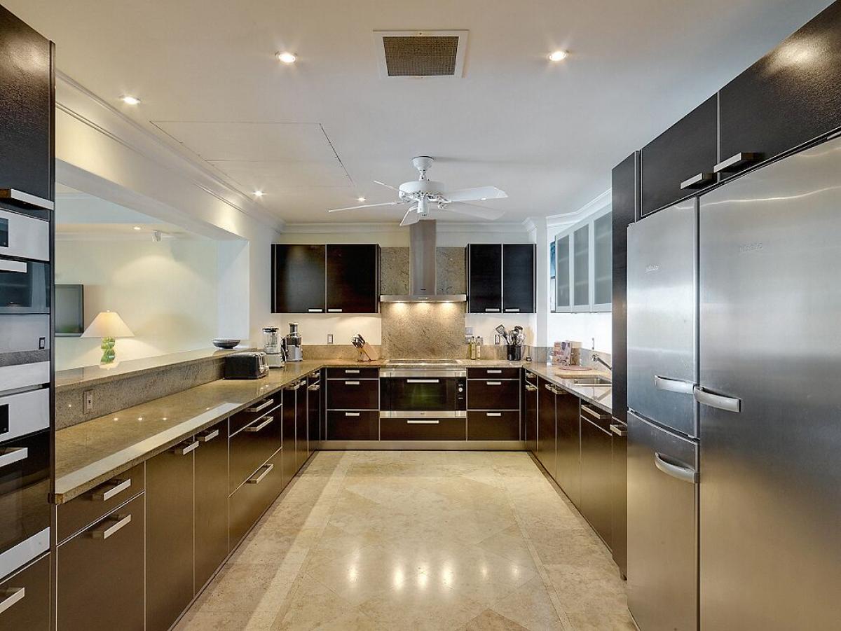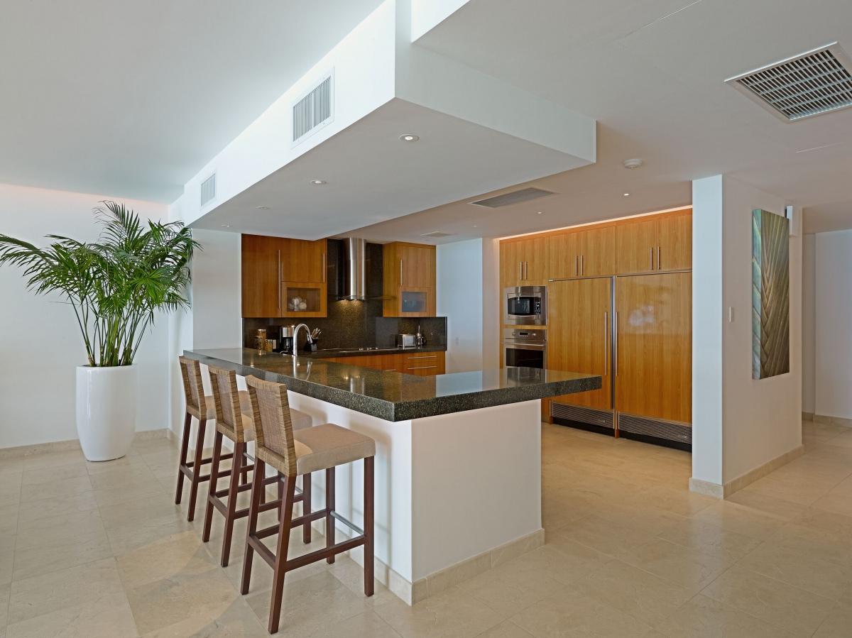 The ultimate in luxury, the apartment features marble floors, granite countertops and Ligne Roset furniture throughout. The large open plan living space is light and airy with full length sliding doors that retract completely to provide access to the terrace and amazing views of the Caribbean Sea. The modern kitchen is well equipped with Miele appliances including a large stainless steel fridge/freezer with ice maker, wine cooler, steam oven, stove top and oven, dishwasher, Nespresso coffee machine and blender.