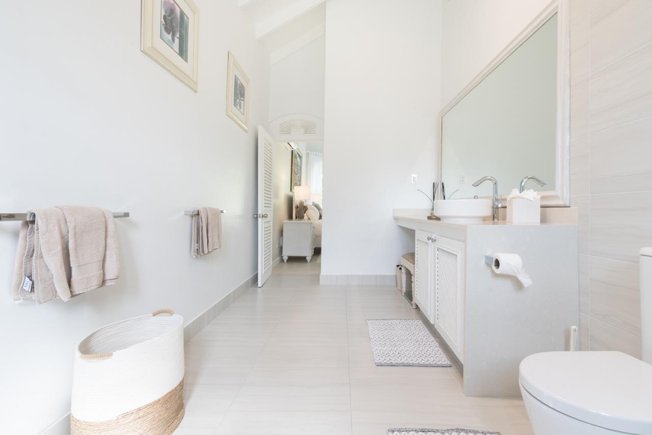 A generous living area and seven bedrooms across the three levels accommodate up to fourteen guests. Four suites are located on the main level, two of which have direct access to the pool deck, family room, powder room, and kitchen. The primary bedroom spans 1,400 sq. ft., the entire first floor, with balconies that overlook the pool deck and the Sandy Lane Estate. One side of this suite has his and hers closets, while the other is the ensuite bathroom with a jacuzzi tub. The final two bedrooms are located on the basement level, along with the home theatre.