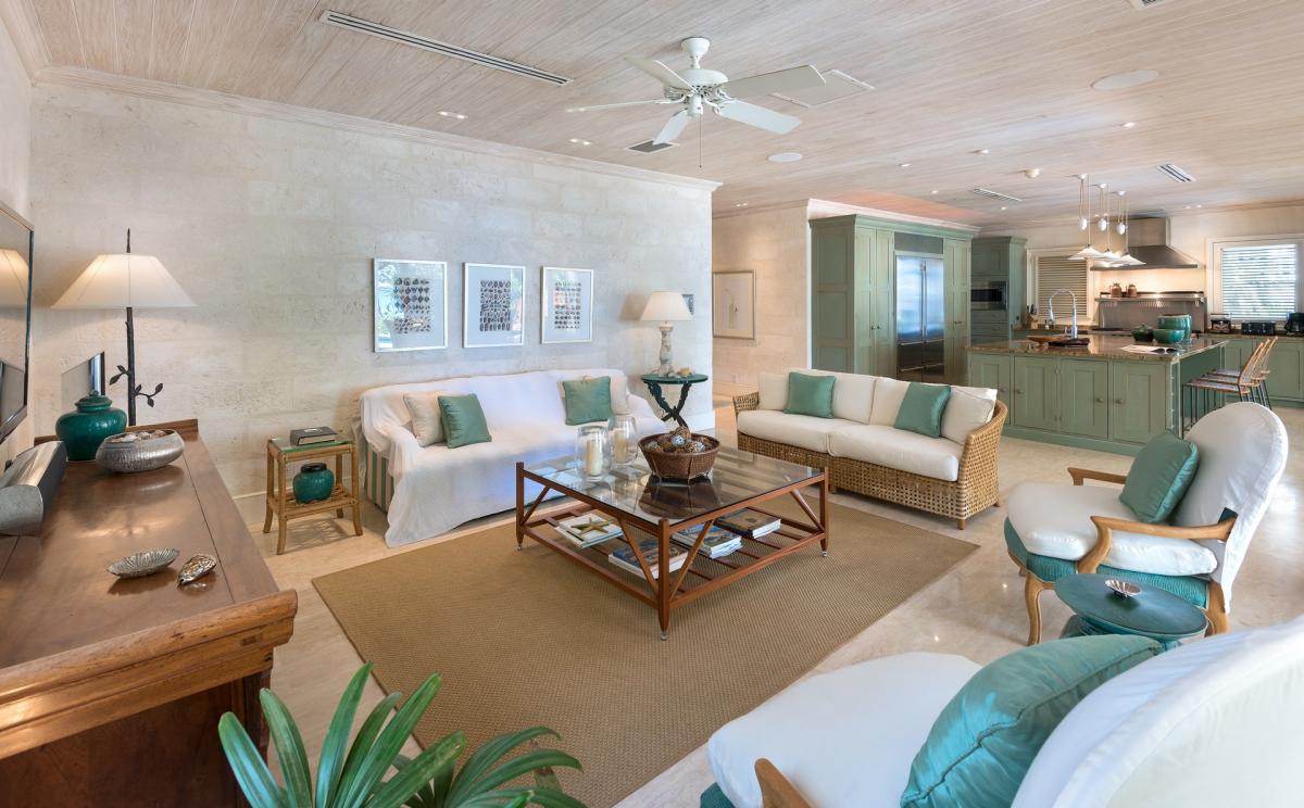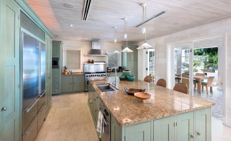 The pool is equipped with comfortable seating near a barbecue and wet bar. Al fresco dining for six is situated with a view over Gibbes Bay. Inside, the fully equipped gourmet kitchen is just off a large patio. Villa Latitude features a state of the art entertainment system throughout the home.