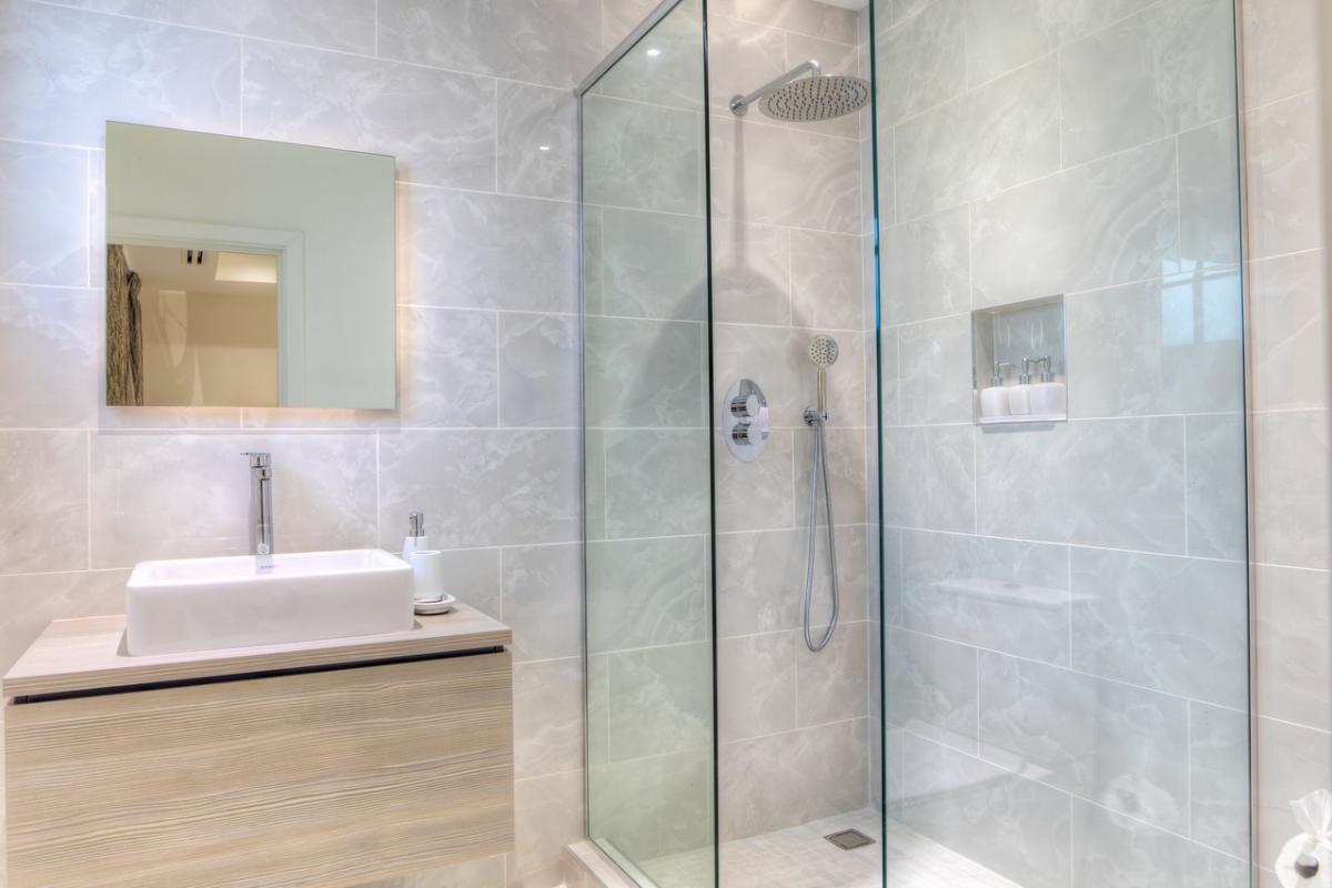 The master bedroom, located adjacent to the living area, offers direct access to the patio and stunning sea views through expansive glass doors. It features a walk-in closet and a luxurious en suite bathroom with a standalone tub and a rain shower. The condo's additional three bedrooms are elegantly designed, with ample natural light, a mix of walk-in and built-in closets, and en suite bathrooms featuring rain showers. For added privacy, a detached annex known as "the cottage" houses a fifth bedroom. Accessible from the condo and privately from the parking lot, it includes an open-plan living area, a kitchenette, and a spacious bedroom, ideal for extended family or guests.