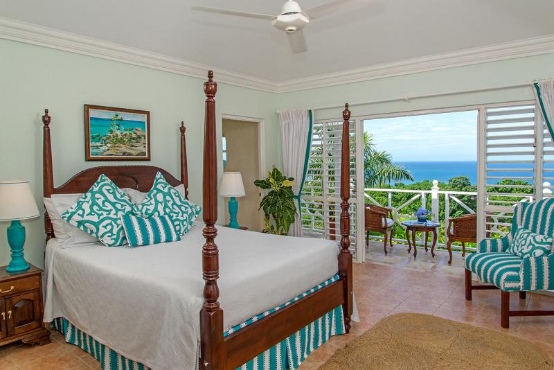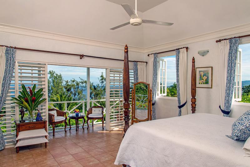 Bedroom 1: Primary with king mahogany canopy bed, private balcony, ocean view, walkway to pool, en suite bathroom with large walk-in shower