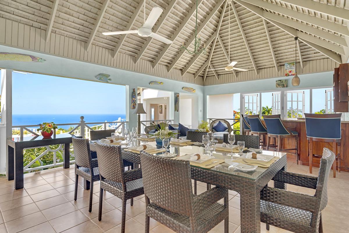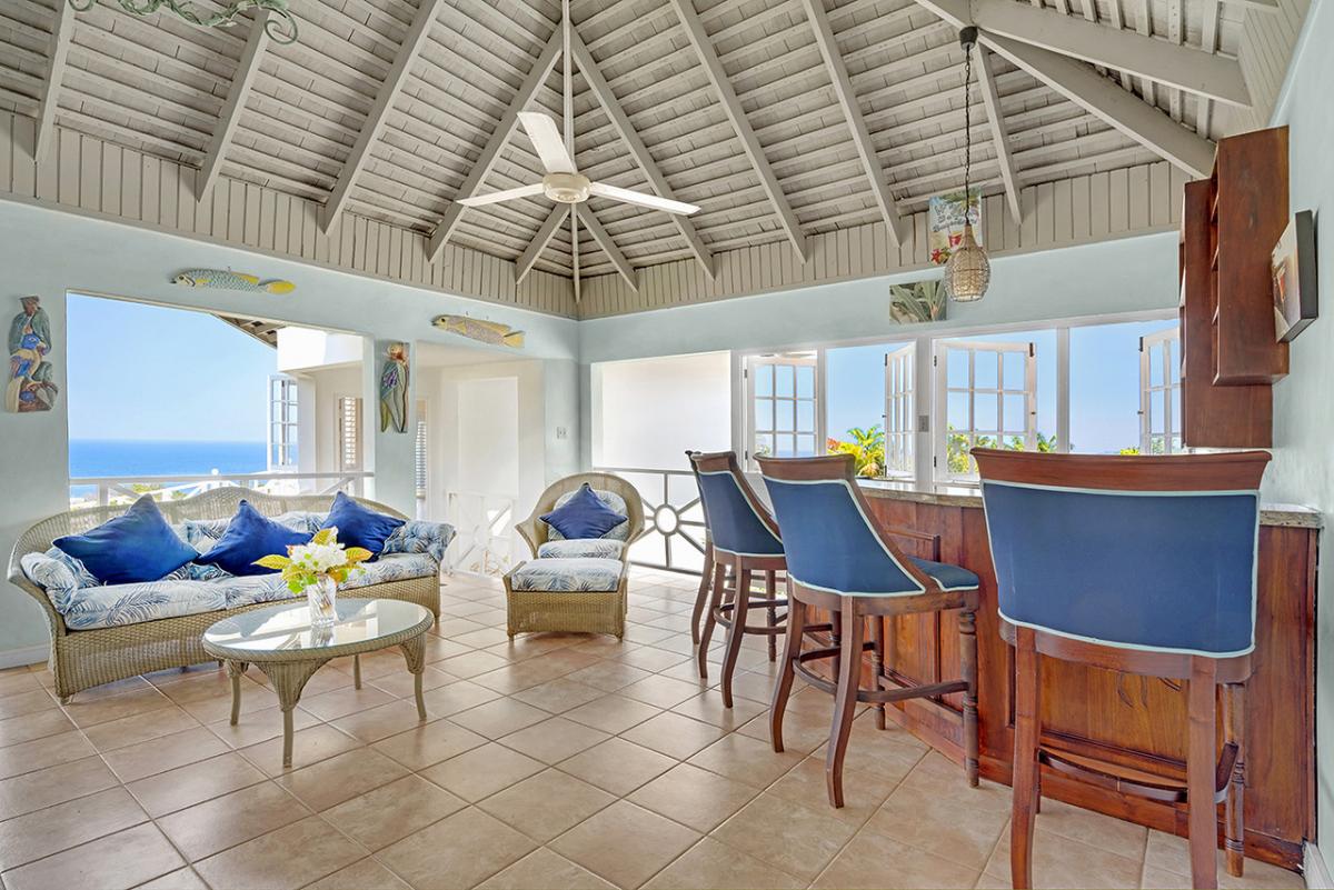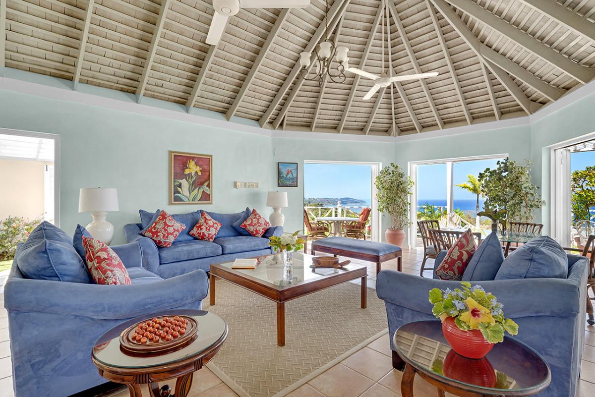 The central part of the villa is the large living room with high rafter-and-beam ceiling. This space opens wide to a wrap-around verandah that captures the breathtaking view and refreshing tradewinds.