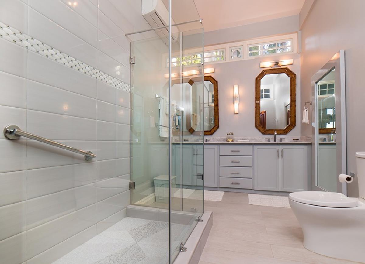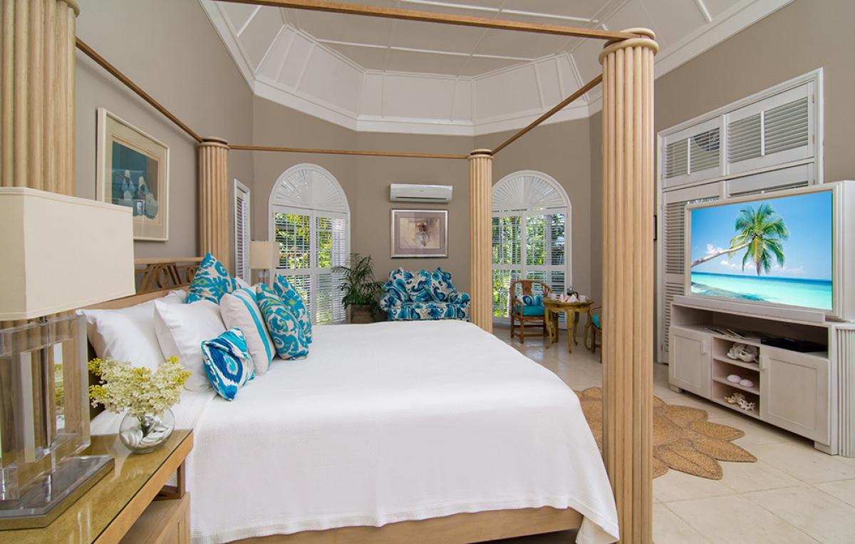 Bedroom 6: This room is located downstairs. Bedroom 6 is equipped with a king-sized bed, a flat-screen television, and an ensuite bathroom with a tub/shower combination. Bedroom 6 also has glass doors to a furnished porch with an ocean view.