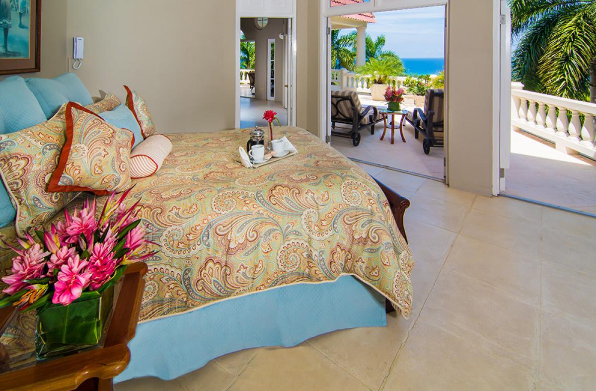 Bedroom 2: This room is located upstairs. Bedroom 2 is equipped with a queen-sized bed, a flat-screen television, and an ensuite bathroom with a tub/shower combination. Bedroom 2 also has glass doors to a furnished balcony with an ocean view and a connecting door to Bedroom 3.