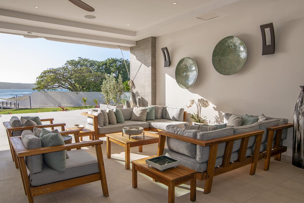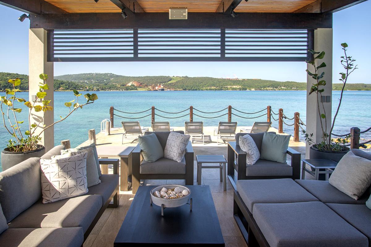 When entering the villa, there is a double-height entrance hall that leads into the main indoor and outdoor living areas. There is a formal dining room with a wall of windows to the left, while to the right, there is a comfortable sitting room with soft, deep leather sofas. To get onto the outdoor terrace with more dining space, seating, a large bar with a TV, and a cappuccino/espresso station, guests have to walk through one of the three 25ft doors. This covered terrace leads to an infinity pool, an outdoor kitchen, a gazebo overlooks a pool, a hot tub, and a grassy lawn. Happy Hour has many outdoor areas for guests to enjoy each other and the surrounding views.