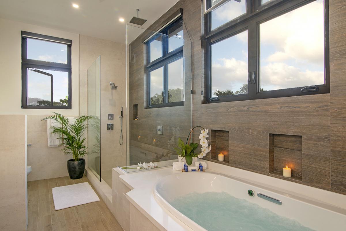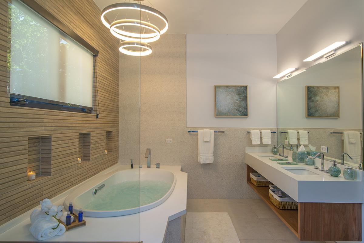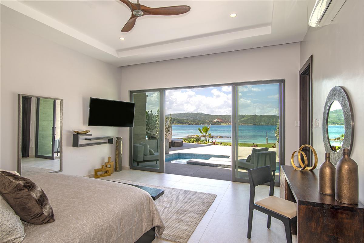 Primary Bedroom 1: This room is located on the lower level and has a king-sized bed, remote-controlled air conditioning, a ceiling fan, a flat-screen TV, a personal safe, and a walk-in closet. The room also has an en-suite bathroom equipped with a jacuzzi tub, a walk-in rain shower, a double vanity, toilet, and bidet. A veranda that faces the ocean is also included.
