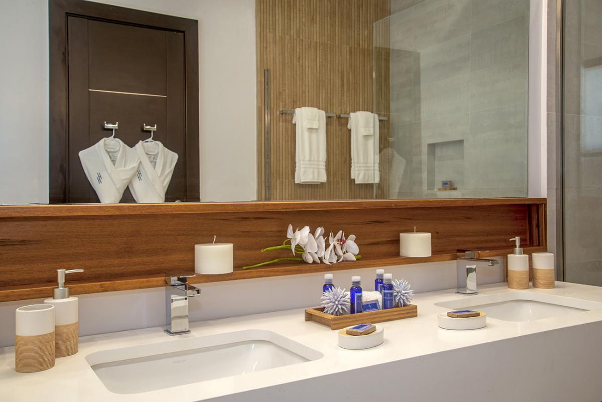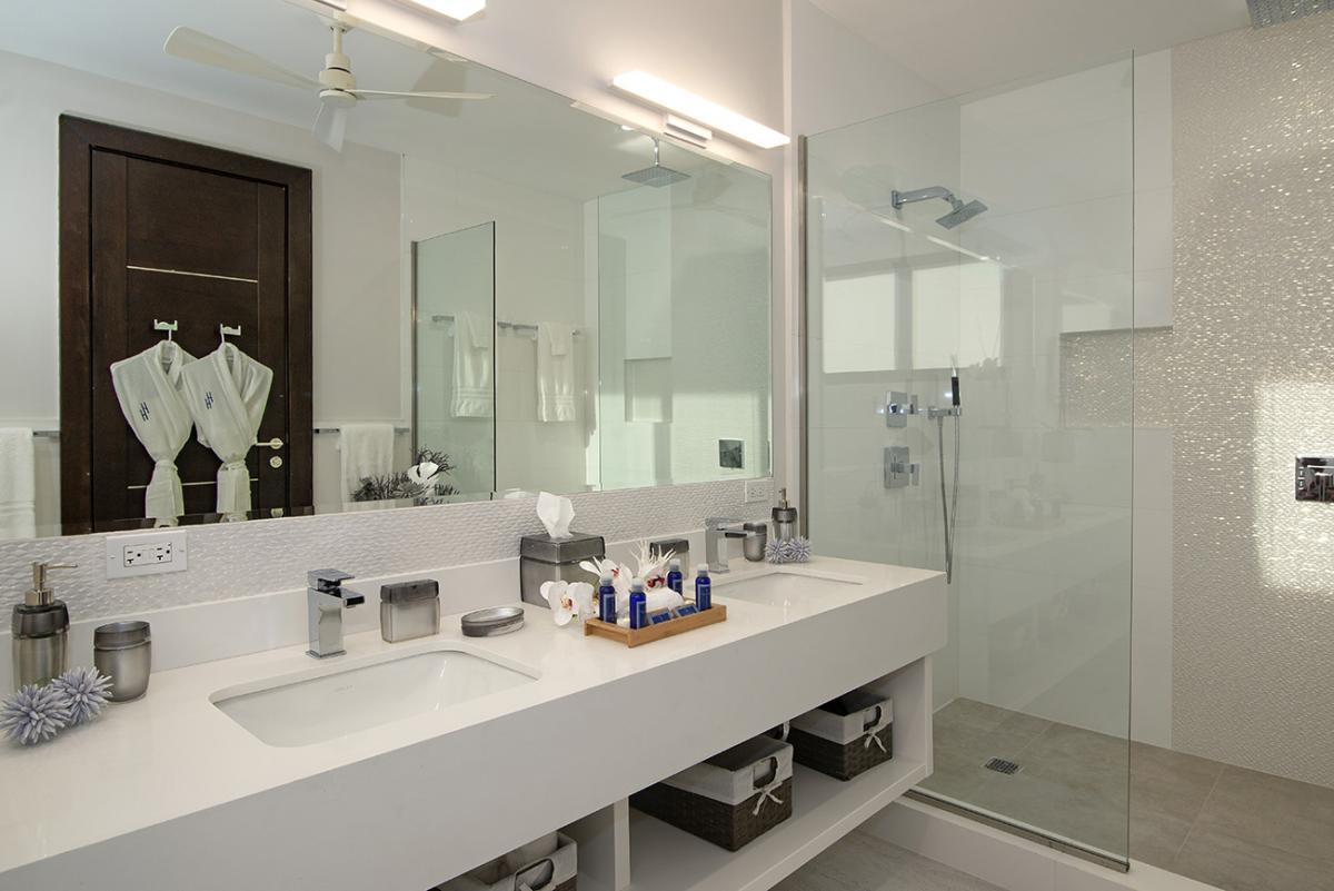 Bedroom 2: This room is located on the lower level and it has a king-sized bed, remote-controlled air conditioning, a ceiling fan, a flat-screen TV, a personal safe, and a walk-in closet. This room also has an en-suite bathroom equipped with a walk-in rain shower, and double vanities. A veranda that is facing the ocean is also included.
