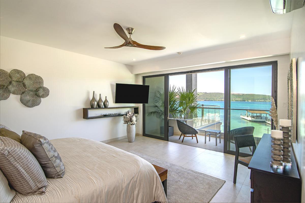 Bedroom 4: This room is located on the upper level and has a king-sized bed, remote-controlled air conditioning, a ceiling fan, a flat-screen TV, a personal safe, and a walk-in closet. The room also has an en-suite bathroom equipped with a walk-in rain shower, a double vanity, a toilet, and a bidet. A balcony that faces the ocean is also included.