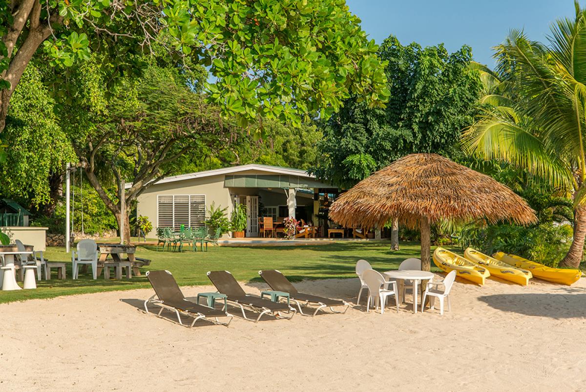 This 3-bedroom casual cottage shares a delightful waterfront site with its sister property, Coral Cove Villa, on the clear waters of Discovery Bay. Linga-Awile sits on a lovely, long, large lawn. Beyond the lawn and swimming pool is its sugary white sand beach with two thatched roof umbrellas for shade.