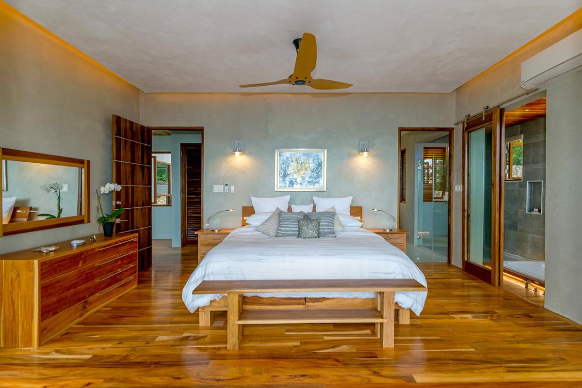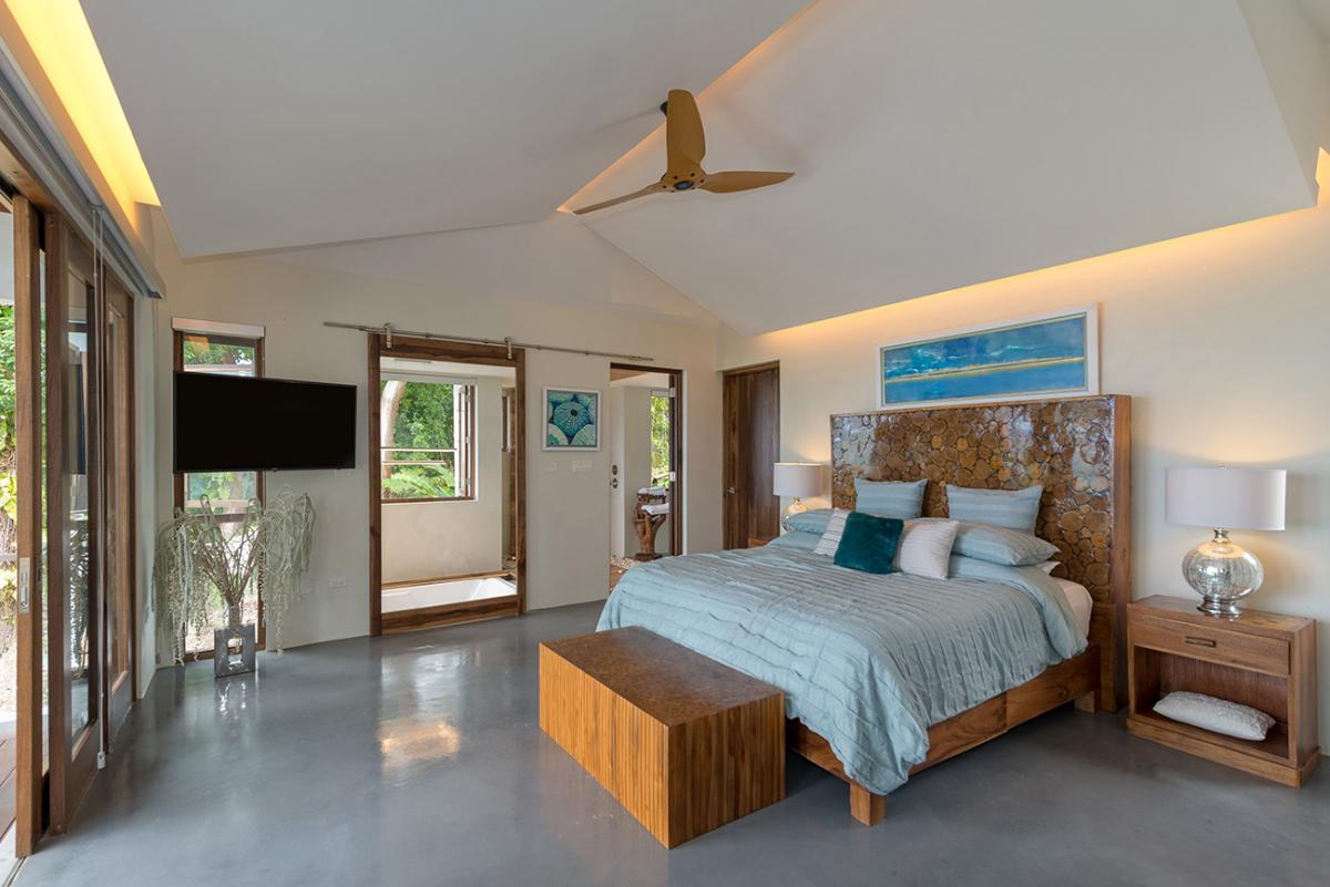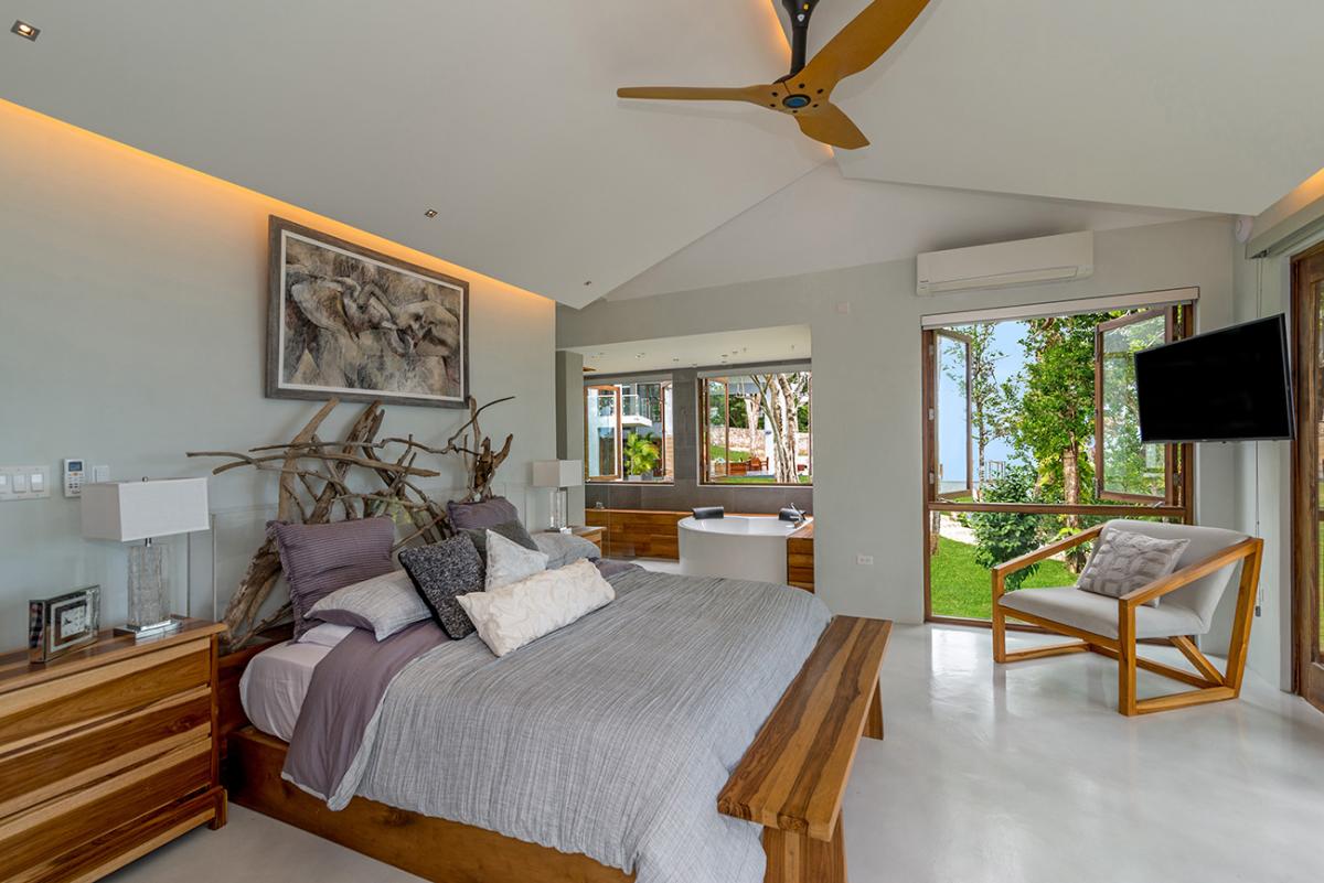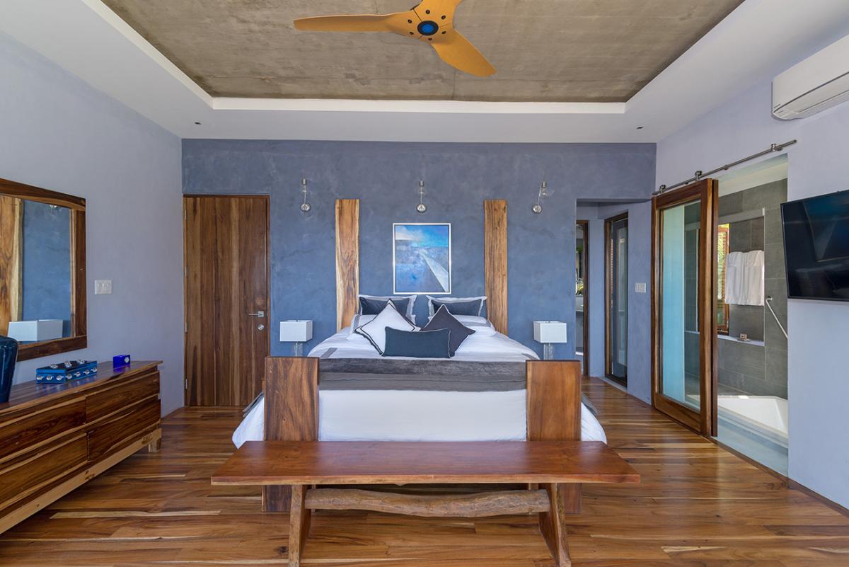 Bedroom 6: This room is located on the upper level of the east wing.  It is equipped with a king-sized bed, a ceiling fan, a flat-screen TV, and remote-controlled air conditioning. This suite also has an en-suite bathroom equipped with double vanities, a stand-alone tub, and a walk-in rain shower. The room also has french doors that open to a balcony.