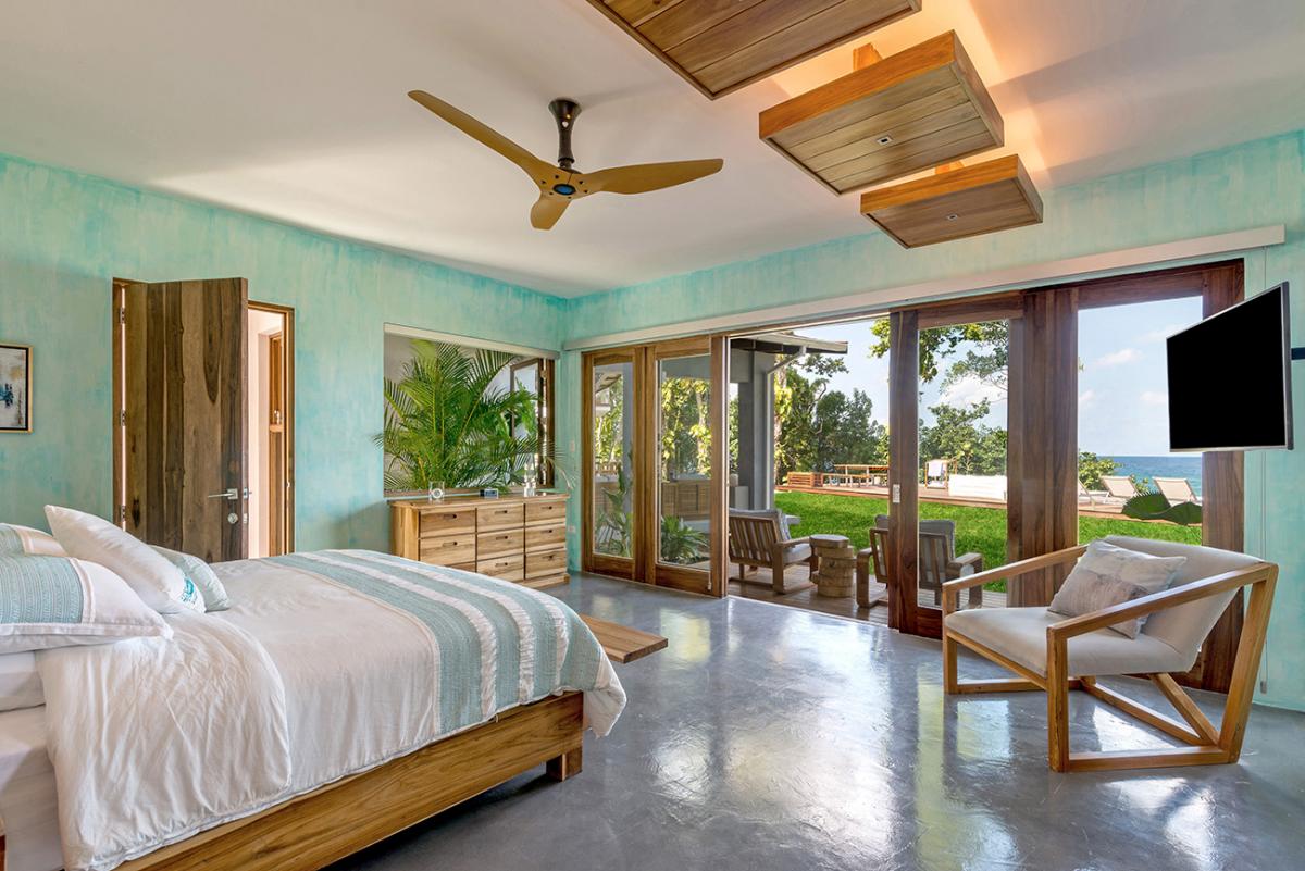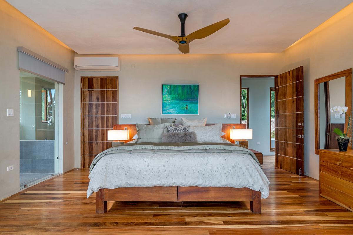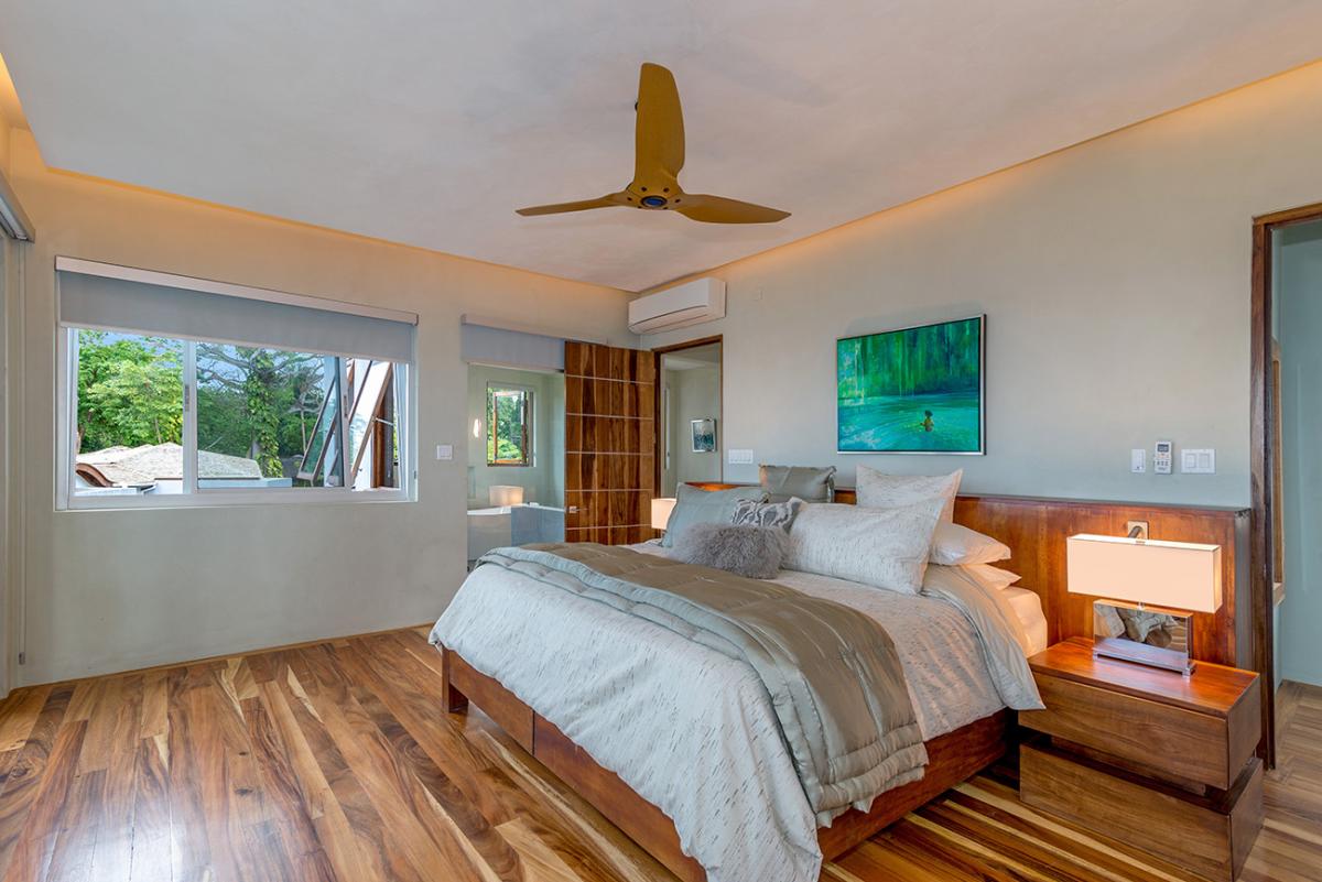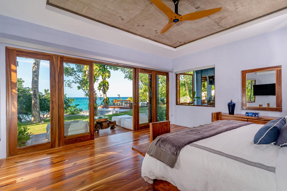 Bedroom 6: This room is located on the upper level of the east wing.  It is equipped with a king-sized bed, a ceiling fan, a flat-screen TV, and remote-controlled air conditioning. This suite also has an en-suite bathroom equipped with double vanities, a stand-alone tub, and a walk-in rain shower. The room also has french doors that open to a balcony.