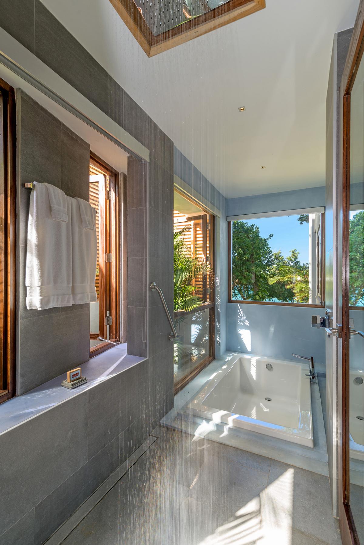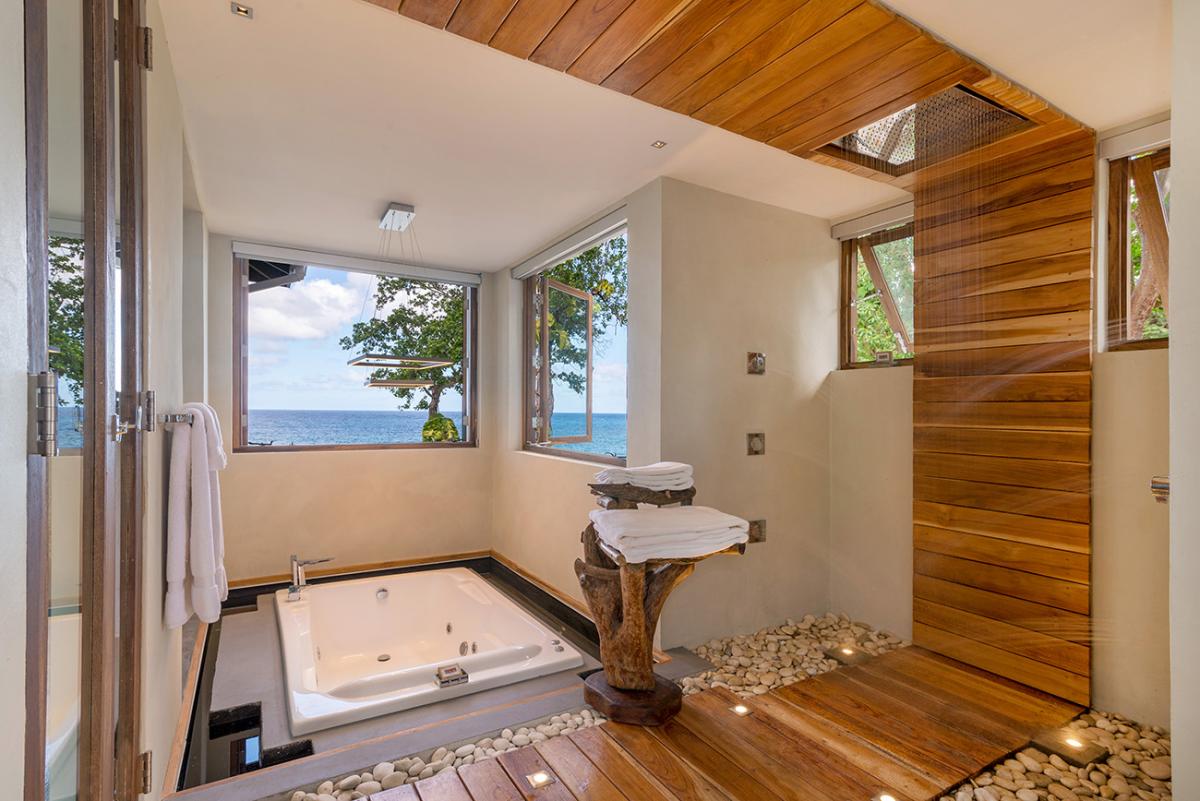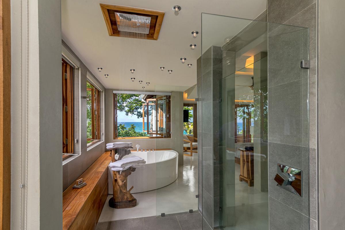 Bedroom 5: This room is located on the ground floor of the east wing. It is equipped with a king-sized bed, a ceiling fan, a flat-screen TV, and remote-controlled air conditioning. This suite also has an en-suite bathroom equipped with double vanities, a large deep tub, and a walk-in rain shower. The room also has french doors that open to a terrace.