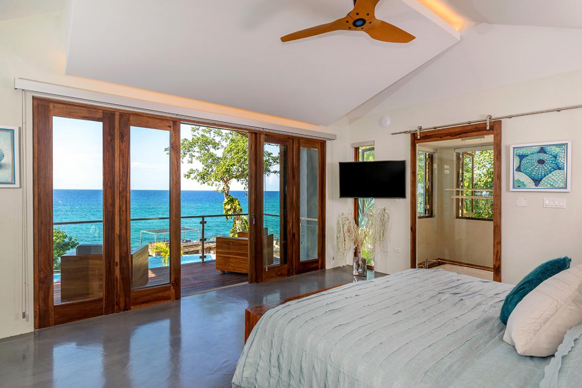 Bedroom 7: This room is located on the upper level of the west wing.  It is equipped with a king-sized bed, a ceiling fan, a flat-screen TV, and remote-controlled air conditioning. This suite also has an en-suite bathroom equipped with double vanities and a walk-in rain shower. The room also has french doors that open to a balcony.