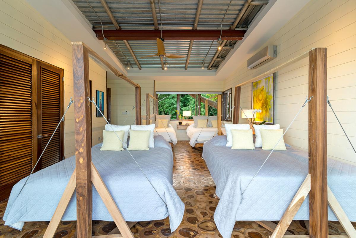 Bedroom 8: This room is located on the second level of the west wing. It is equipped with four queen-sized beds, a ceiling fan, a flat-screen TV, and remote-controlled air conditioning. This suite also has an en-suite bathroom equipped with double vanities and a soaking tub. The room also has a balcony.