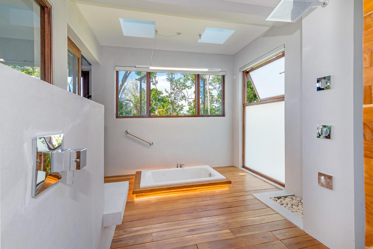Bedroom 4: This room is located on the upper level of the east wing. It is equipped with a king-sized bed, a ceiling fan, a flat-screen TV, and remote-controlled air conditioning. This suite also has an en-suite bathroom equipped with double vanities, a large corner tub, and a walk-in rain shower. The room also has french doors that open to a lovely balcony.