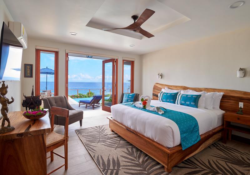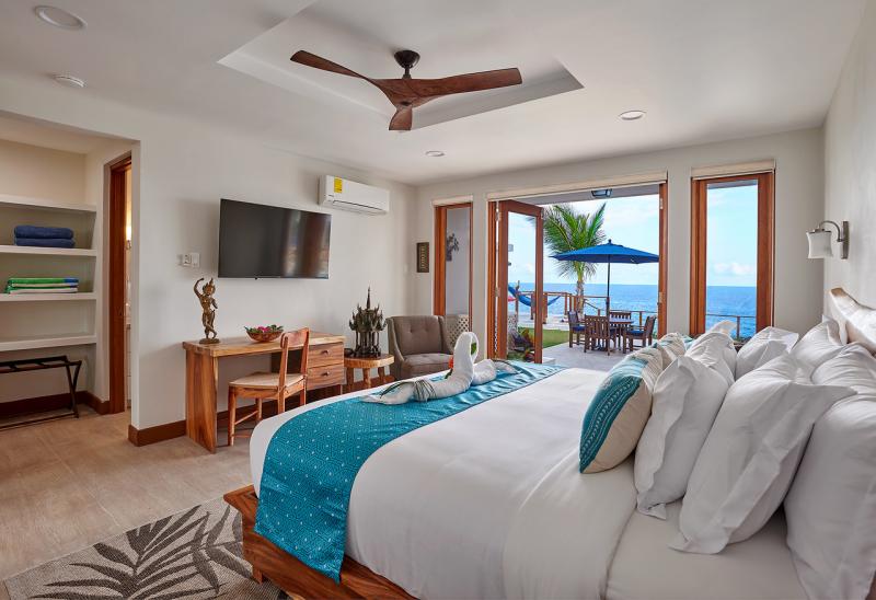 Bedroom 5: This room is located on the upper level and is equipped with a queen-sized bed, air conditioning, a ceiling fan, a flat-screen television with cable access, a sea view, and an ensuite bathroom with robes, a safe, and a separate outdoor shower.
