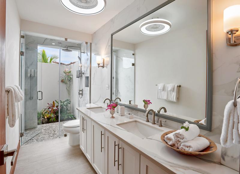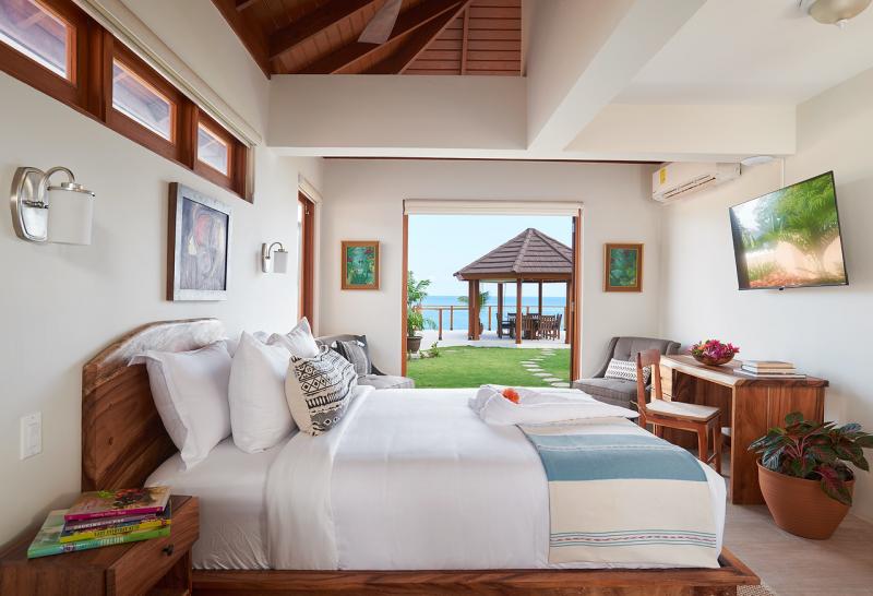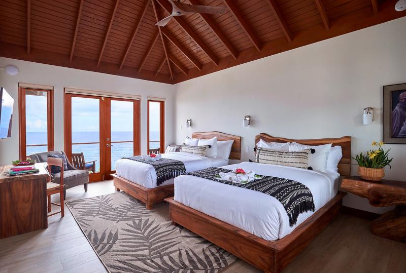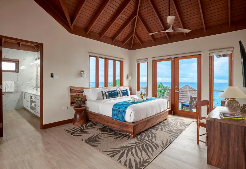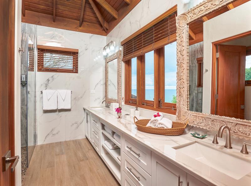 Bedroom 1: This room is located on the ground floor and is equipped with two queen-sized beds, air conditioning, a ceiling fan, a flat-screen television with cable access, a walk-in closet, a sea view, and an ensuite bathroom with robes, a safe, double vanities, and an indoor/outdoor rain shower. Bedroom 1 also has French doors to the pool lawn terrace.