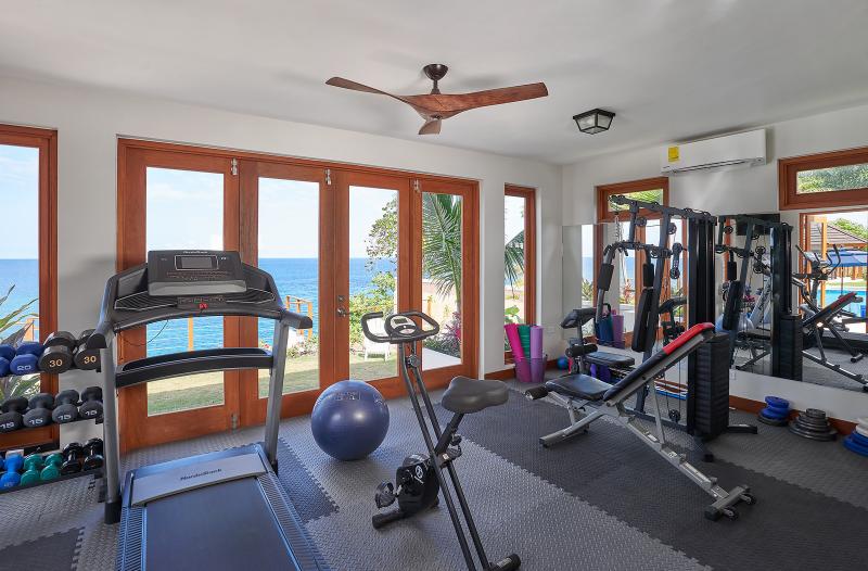 Bedroom 2: This room is located on the ground floor and is equipped with a king-sized bed, air conditioning, a ceiling fan, a flat-screen television with cable access, a walk-in closet, a sea view, and an ensuite bathroom with robes, a safe, double vanities, and an indoor/outdoor rain shower. Bedroom 2 also has French doors to the pool lawn terrace.