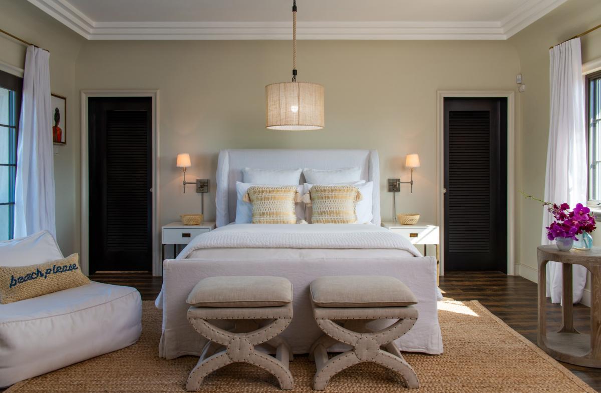 Bedroom 5: Queen bed, morning bar, refrigerator, en suite bathroom with twin vanities and walk-in shower, walk-in closet, private entrance, AC, ceiling fan, TV, bathrobes, safe