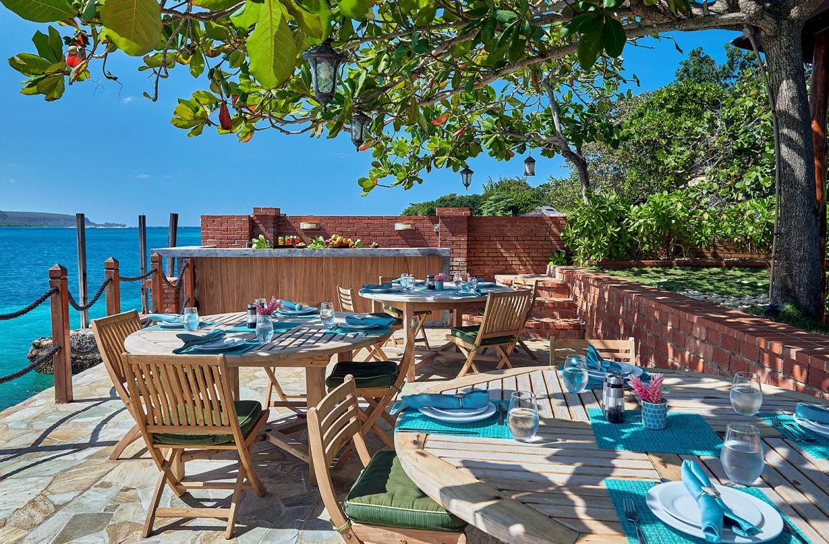 Inside and outside dining tables accommodate up to 14 guests. As a special treat, the staff will plan a torchlight beach party ~ chicken, lobster or fresh-caught fish grilled on the outdoor barbecue. Families renting both villas may have lunches and dinners together on request.