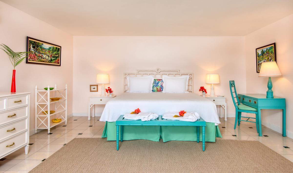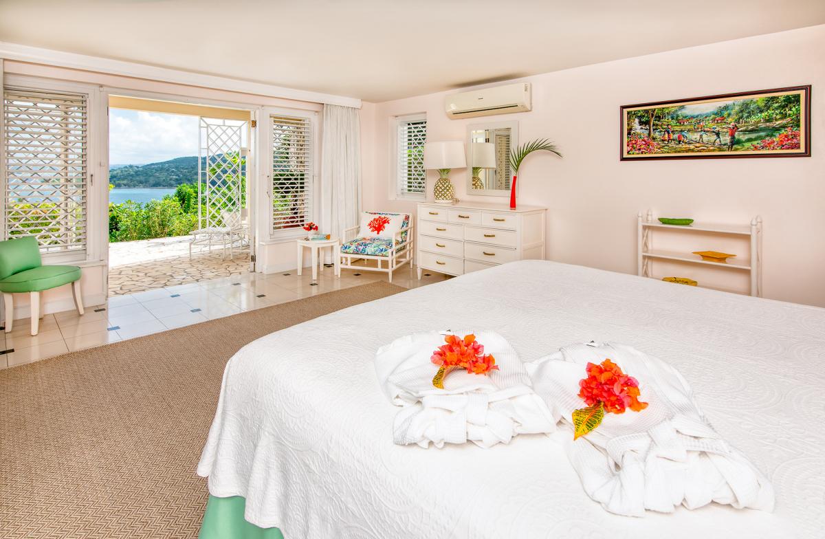 Bedroom 3: This room is equipped with the option of a king-sized bed or two twin-sized beds, a radio player, french doors to a private balcony with an ocean view, and an ensuite bathroom with a tub-shower.