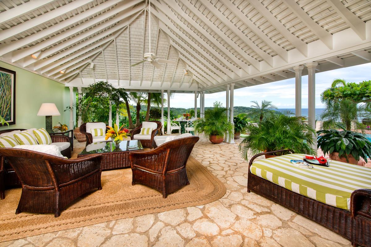 Windsong is an exquisite and very private home four minutes from Round Hill. Designed by noted architect Kasimir Korybut, the site benefits from spectacular views day and night and the most favorable tradewinds. The east view captures the sunrise and Montego Bay ~ the west, an equally lovely vista of Round Hill, the sunset and ocean. The grounds are like a park ~ plentiful with tropical trees bearing almond, coconut, lime, avocado, orange, ackee, breadfruit, fig and papaya and adorned by brilliant hibiscus and bougainvillea. Five fountains grace the indoor gardens. From the central fountain, stone walkways lead to the Great Room, inside dining room, bedrooms and bar ... and the wonderful 700-square-foot verandah with its casual al fresco dining area overlooking the pool.