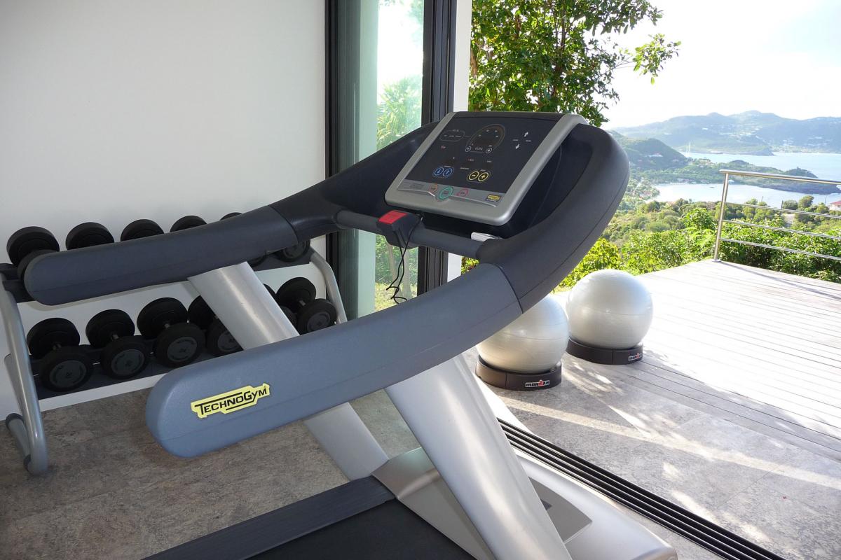 Bedroom 3: independent bungalow with queen bed, air conditioning, fan, mosquito net, safe, TV, DVD, bathroom with shower. Fitness equipment: treadmill, bench, and weights.