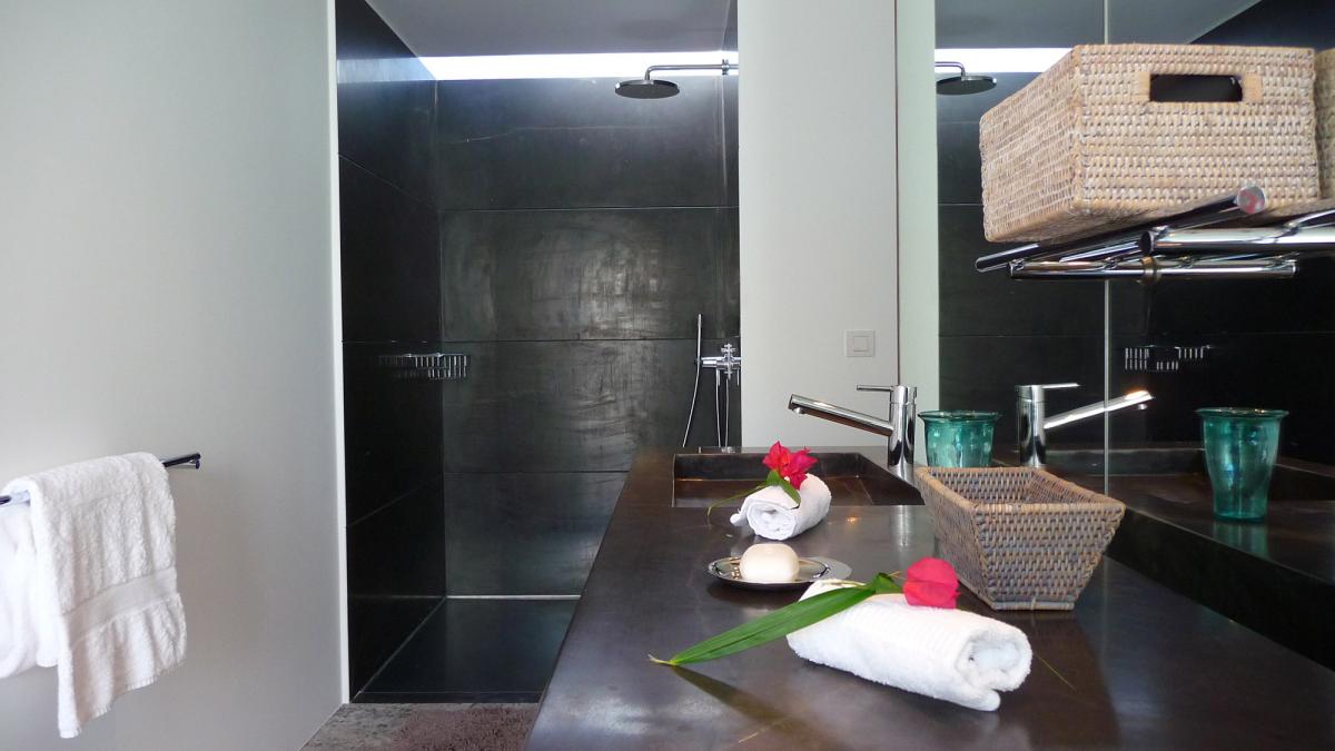 Bedroom 1: king size bed, ensuite bathroom, air conditioning, fan, mosquito net, safe, TV, French satellite, and DVD. There is a large dressing room, outdoor shower and ocean views.