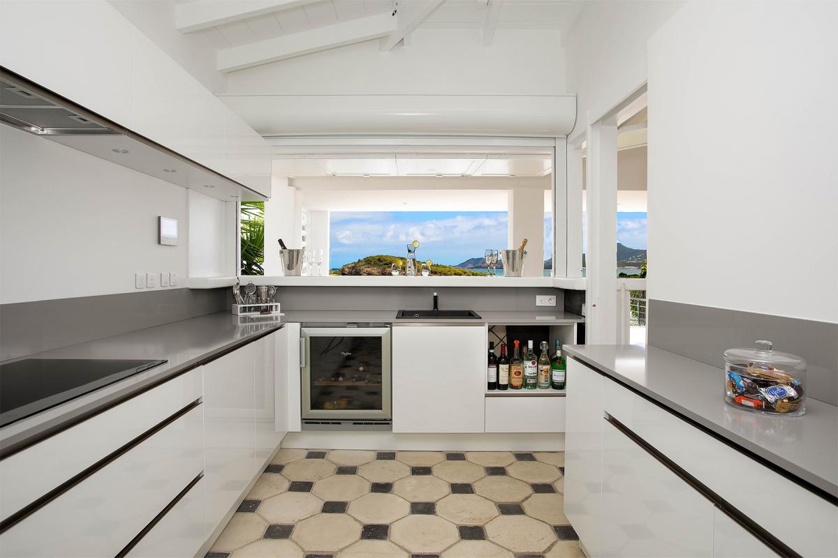 Built on multi-levels to take advantage of the setting, the design creates privacy from every angle. Beautiful native stone work flows through the structure and grounds. The improved terrace areas are dotted with spaces for seating and dining. The fully air-conditioned great room, open to the view and breeze, is fully refurnished in serene colours. Travertine floors run throughout. The fabulous new French kitchen is straight from a design book on Provence. Unique pieces like the antique French butcher’s table, charming accessories and stylish modern stove create the perfect atmosphere to prepare gourmet meals. Garden and sea view surround the kitchen while also overlooking the renovated and enlarged swimming pool.