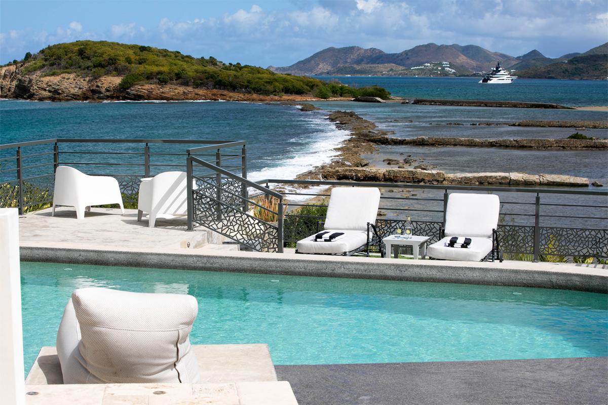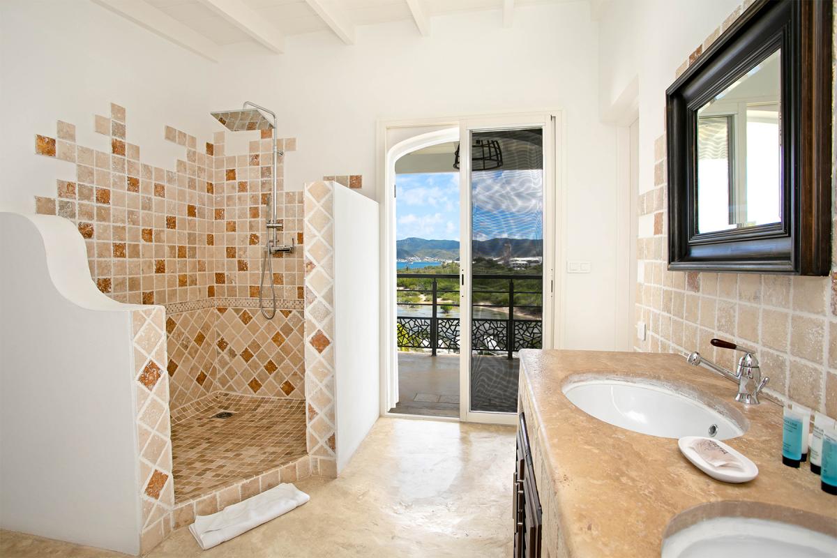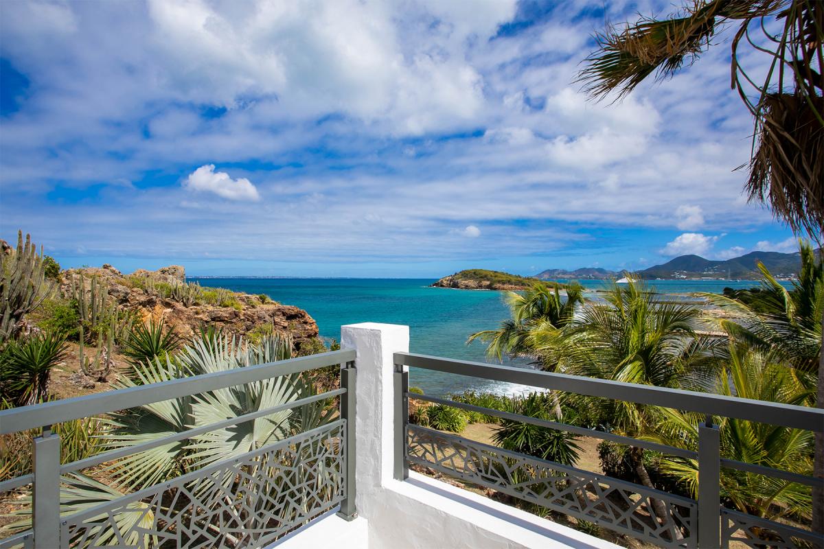 The elegant entrance with its traditional iron gate, coral stone paved courtyard and stonewalls is the perfect showcase for this charming villa. The moment you approach the front door; the stunning panoramic views begin to unfold. With the advantage of a gentle hill setting, the view is a very intimate experience set away from the clamor of daily life. The green mountains, deep blue sea and sky, the sandy beach, Anguilla and tropical foliage flow like a painting. Step through the villa’s private beach gate and you have access to a very secluded sandy inlet.