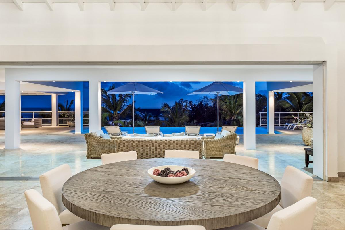 The grand living room is open, airy with an opulent contemporary attitude. Floor to ceiling doors disappear into the wall providing unobstructed views and breezes. Sand color travertine tiles flow seamlessly from indoors to outdoors. Gorgeous designer furniture detailed in beautiful dark woods, comfortable upholstered seating and tasteful art create a relaxing interior lounging area. The color scheme is relaxing in cream, off white and taupe. The sleek and stylish open plan kitchen is open to the view and the exterior dining room, while the barbeque is adjacent to the kitchen. Throughout the villa, pots filled with tropical plants dot the terraces creating a Feng shui attitude.