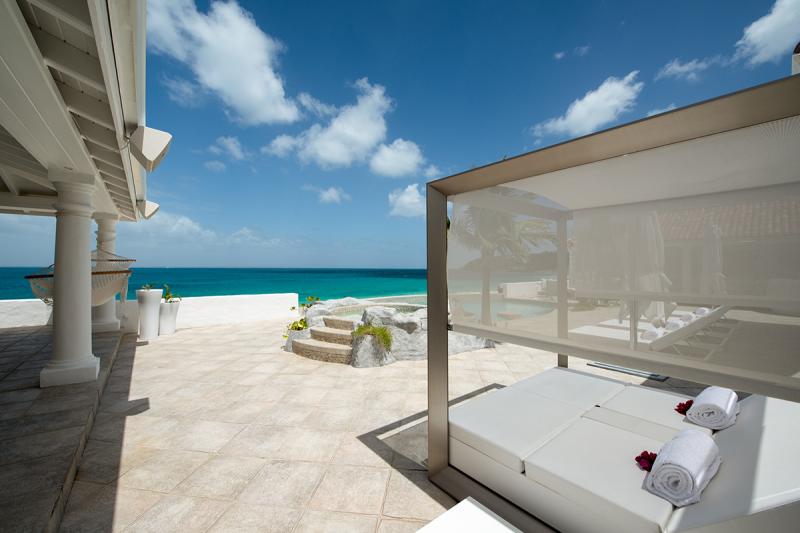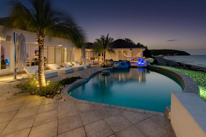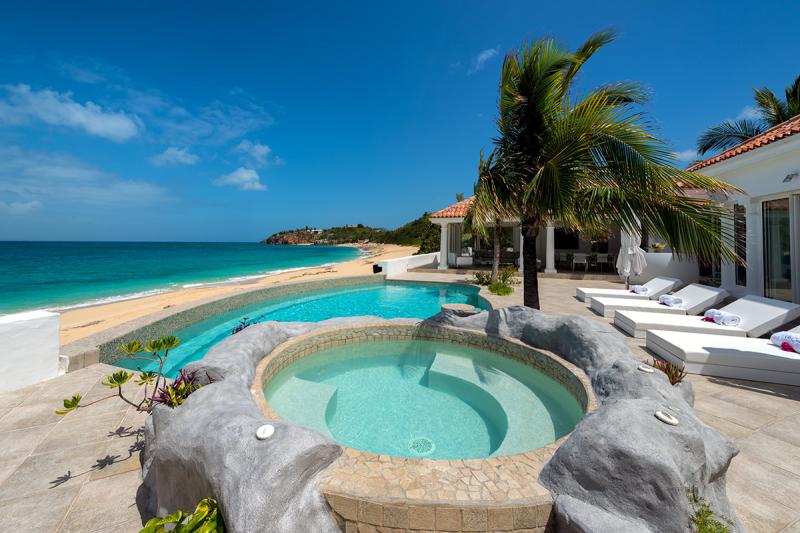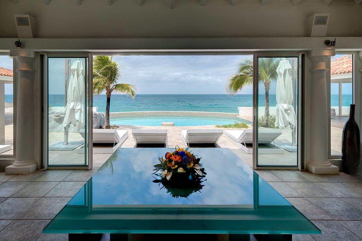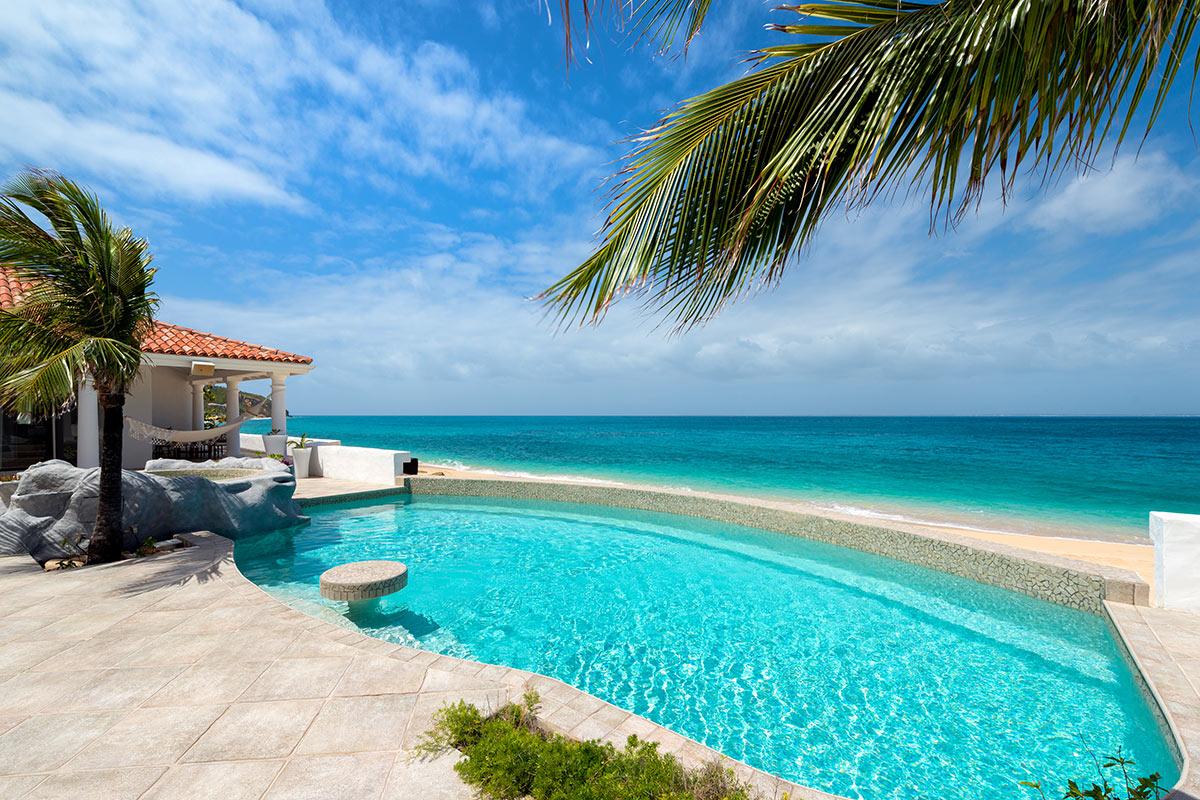 In St Martin, it’s all about the view. Carisa does not disappoint. Stunning sea views flow from every room. The moment you enter this beautiful Caribbean style house, your eyes are drawn from the stylish contemporary interiors directly to the brilliant turquoise sea and the isle of Anguilla. You’re at the water’s edge, separated from the very private beach by a sensual pool with tropical waterfall, natural boulders and relaxing hot tub inset into the sand color travertine terrace.