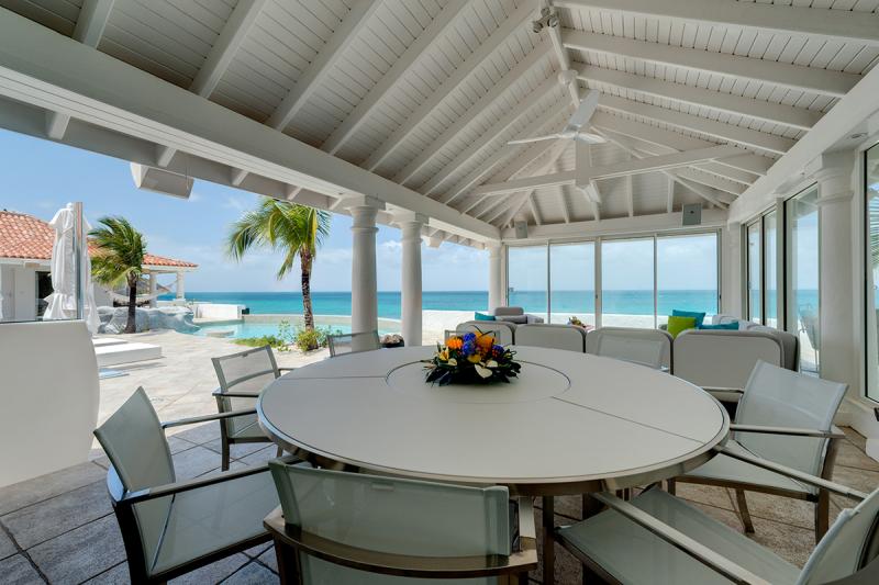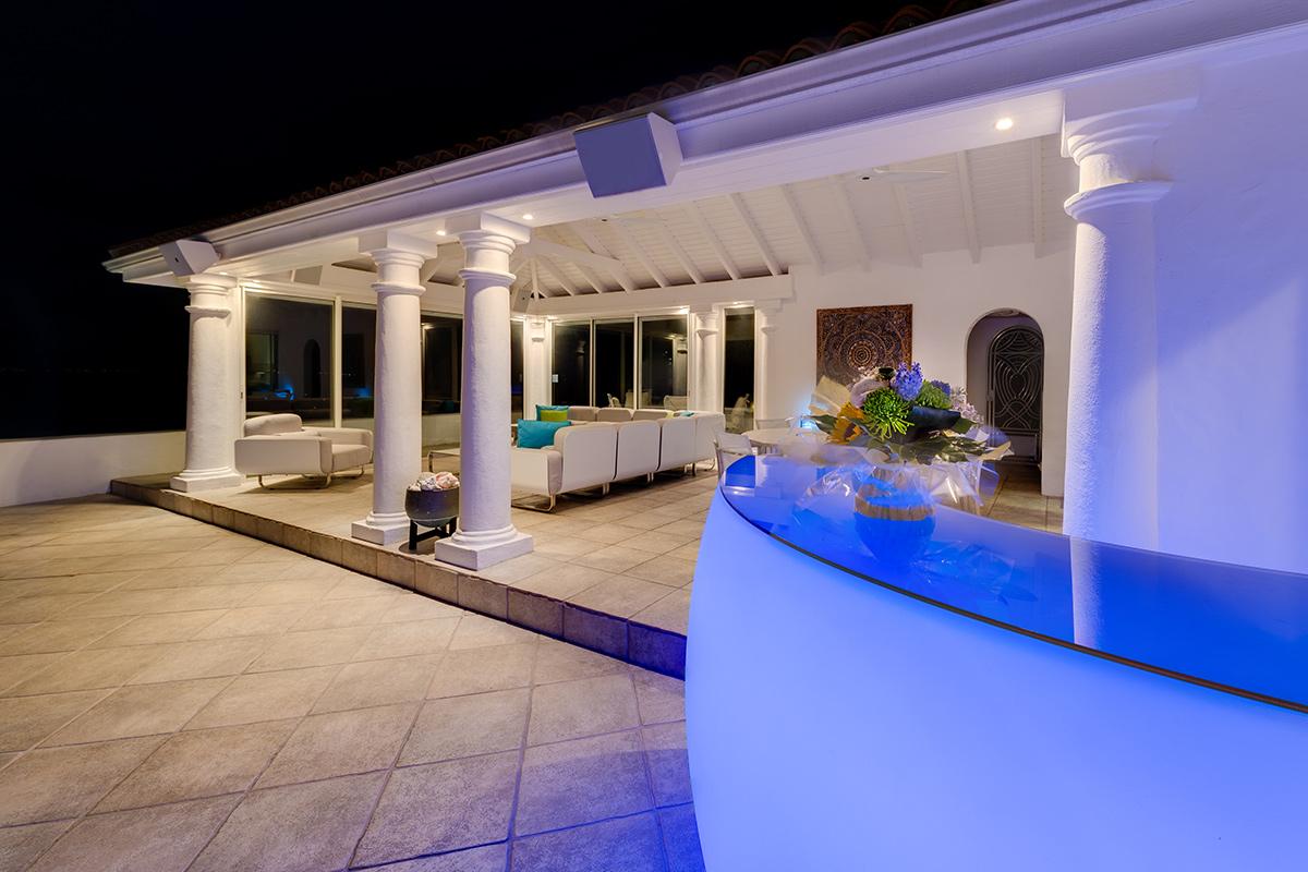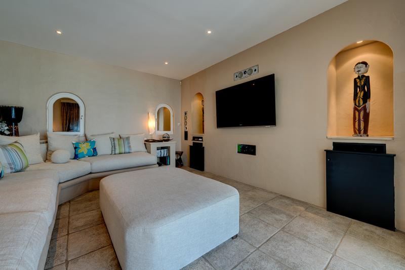 Nothing interferes with the view. Glass doors open wide letting in the sea air or close to capture the air conditioning. The serene interiors, in cream, beige and grey accented with natural wood tones and pops of color, complement the view. Travertine floors flow throughout the interiors and exterior. The main living room is filled with comfortable seating. Just off the main space is a separate state of the art, sound proof media room. Just beyond is the modern, well equipped kitchen designed in white, marble and stainless steel. One overlooks the sea while preparing a meal. Sliding glass doors provide easy access to the spacious covered outdoor dining room and lounge area.