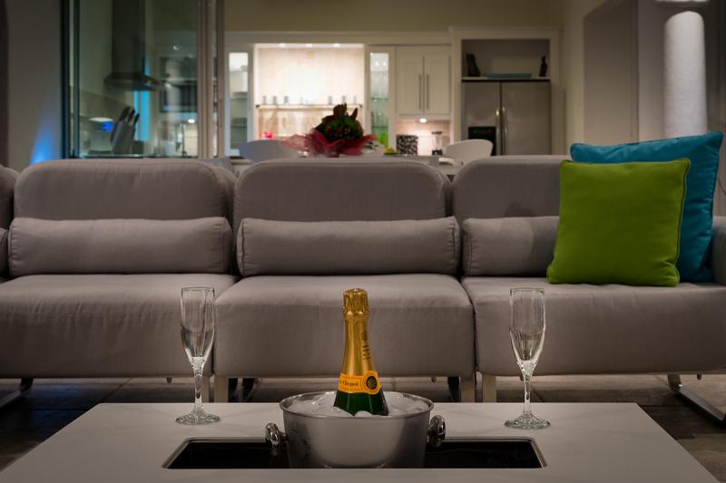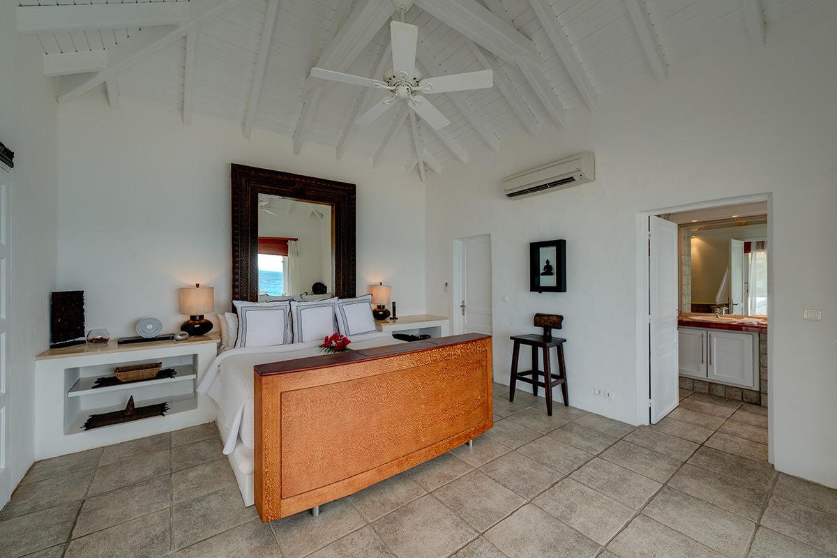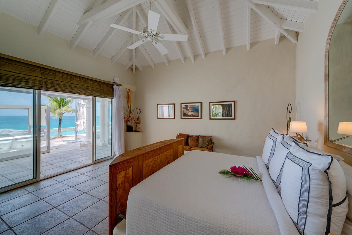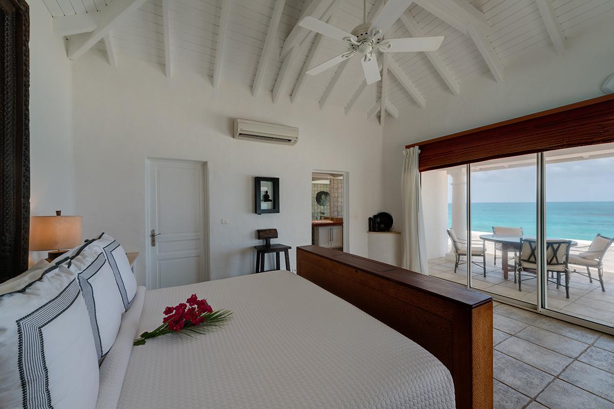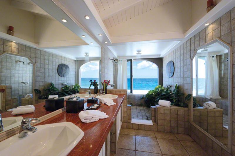 At the opposite end of the villa, wake up to ocean views from each of the two modern, yet romantic bedrooms in soothing shades of white, sandy beige and grey. Custom furniture includes comfortable beds with flat screen TVs in the foot board. With a flick of the remote, raise and lower the TV as well as close the blackout shades. En suite baths with dressing rooms feel like spacious spas. One bath has a private terrace; the other overlooks the sea. Both bedrooms have air conditioning, Wi-Fi access and private seating areas.